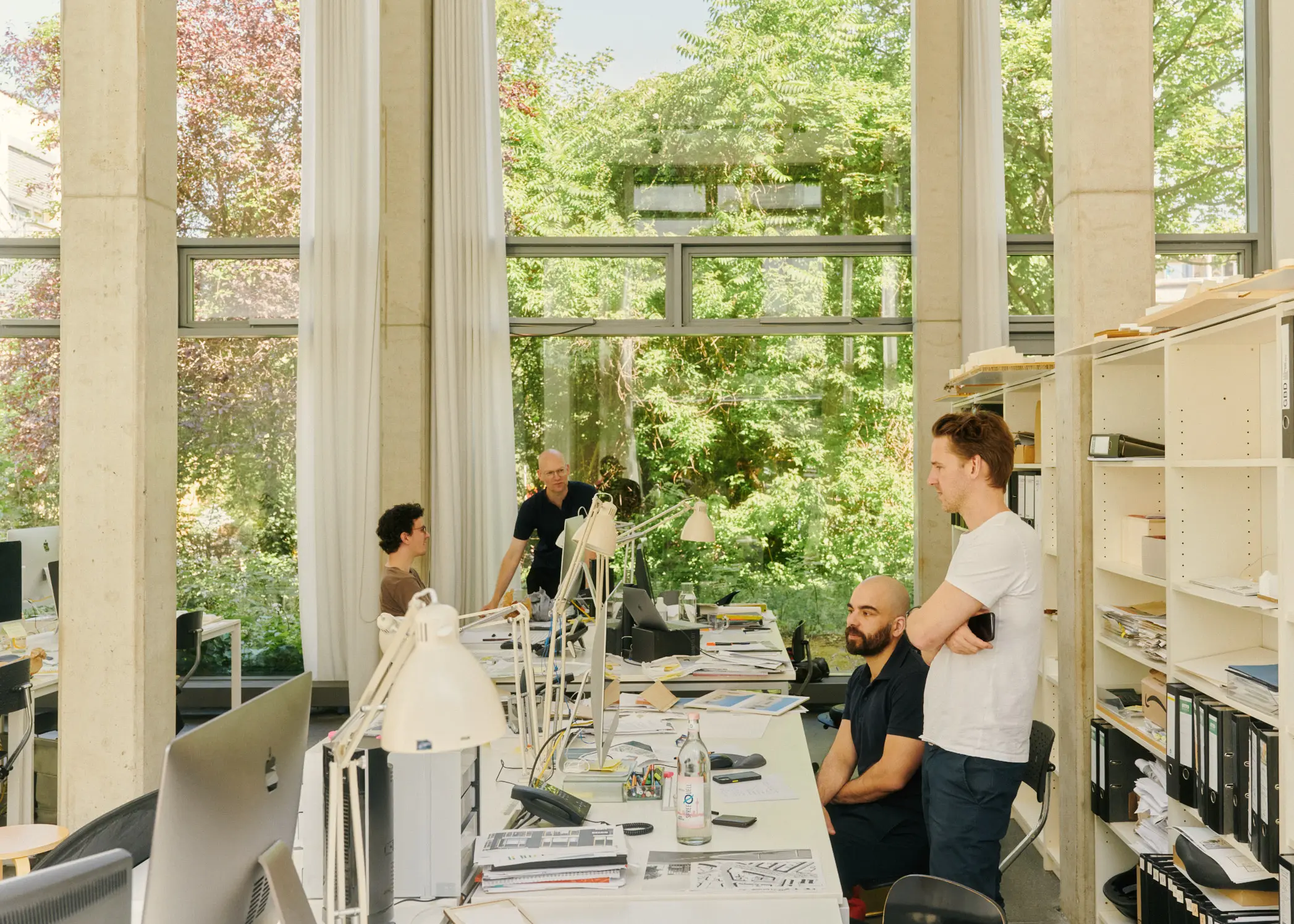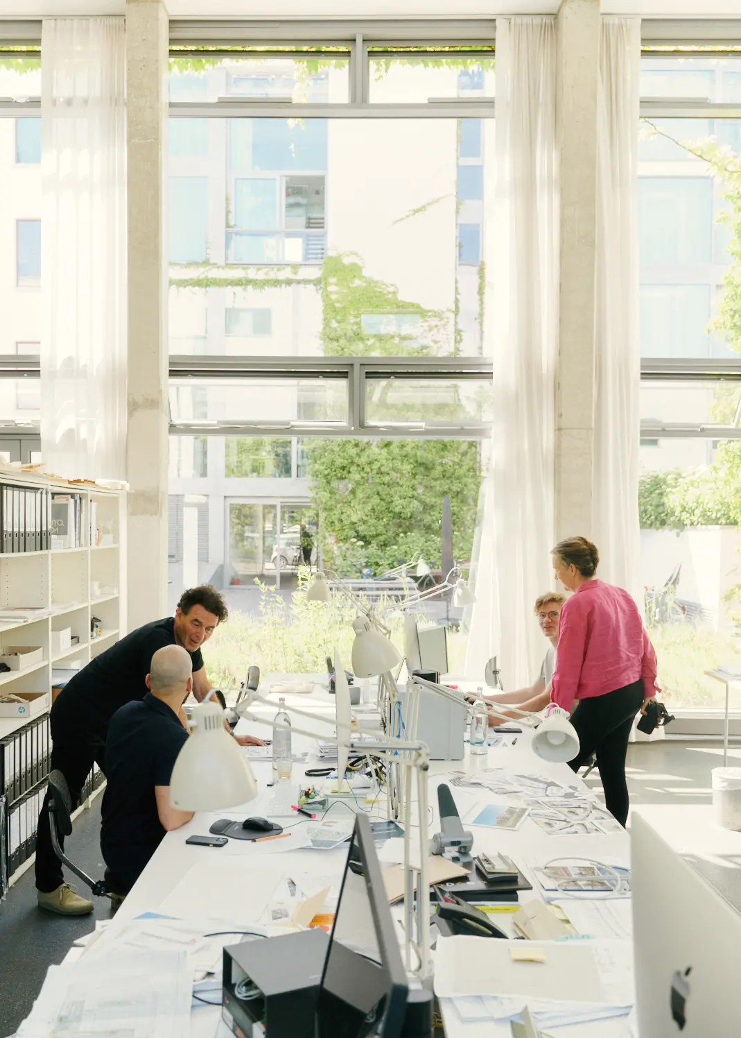 Almut Right now, we are in our office in Auguststraße, and the building is about 20 years old. We designed the building not only for us but for a group of people—friends and family. It’s a “Baugruppen” project where we all shared the financial burden to construct the building. We made this place our family home and the home of other people who joined this house’s community. For us, it opened the possibility of having a very close spatial connection between the office and the private family space.