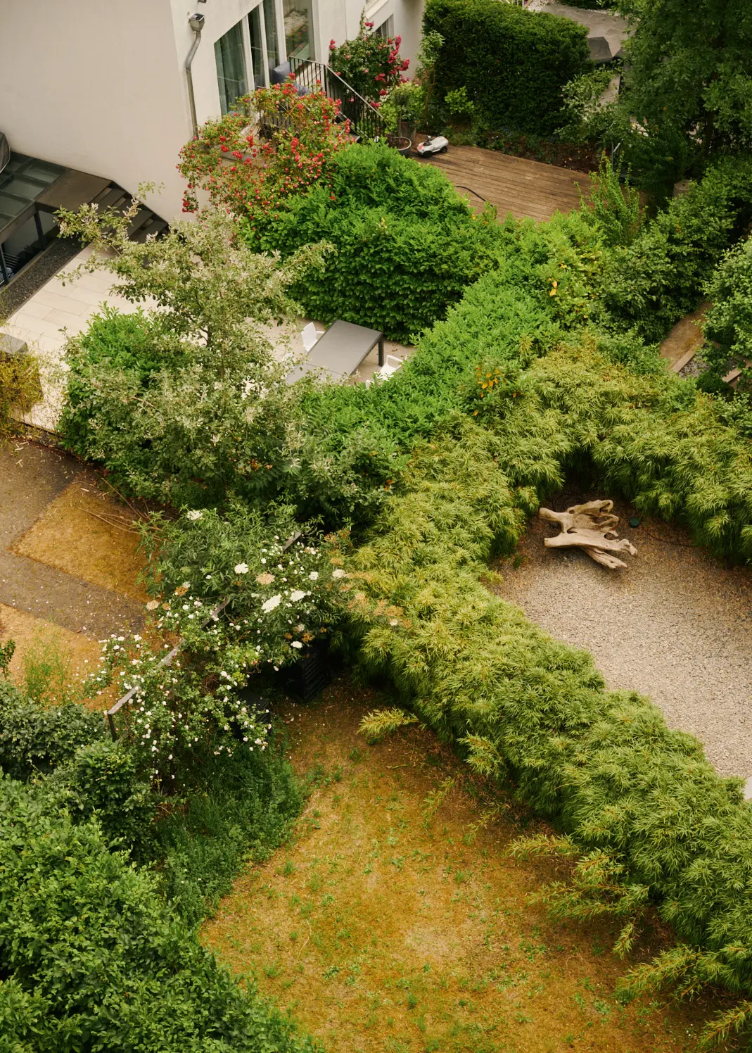 Armand The process always starts merely with the facts—where the sun rises, where the sun goes down, where the traffic is, or where the calm area of the garden could be. It’s research on how to accommodate a space into a bigger urban context. In this case, we agreed in the very beginning with the client on having an open house to have the best of both worlds: The liberty and openness of a bird’s nest on the one hand and the coziness of a cave on the other. One of the main characteristics of the house is that you don’t have any doors. It’s completely open. It’s like a sculpture by Eduardo Chillida, which you experience from the inside. In this project, one of the main focus points is movement.