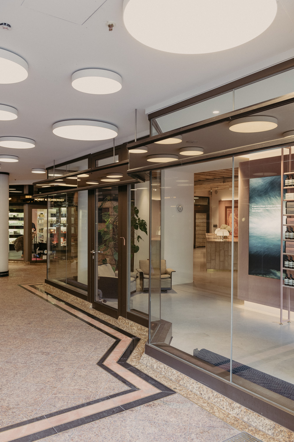 With golden pilaster strips and pink-colored granite the post-war renovation of the Luitpold-Passage reinvigorates the aesthetics of its heyday.