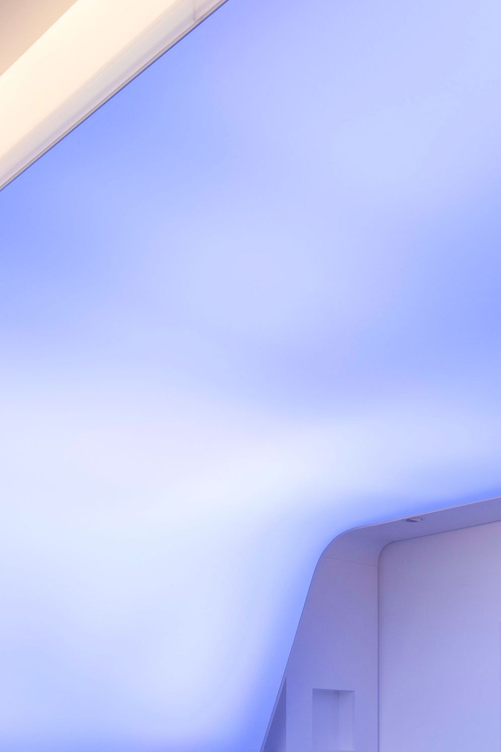 Research into the links between the quantity and quality of light, and our physical and emotional health are not new in architecture. In the past, exposure to daylight and nature has been central to design for healing and even considered as a treatment for illness. Until antibiotics were widely available after World War II, the state-of-the-art treatments for tuberculosis were daylight and fresh air ‘treatments’ which involved relaxing outdoors. These sparked new health care typologies, like sanatoria (a notable example is Alvar Aalto’s Paimio Sanatorium built in 1933) and cure cottages (such as those at Saranac Lake in New York starting from the 1870s), where people recuperated on therapeutic architectural features such as roof decks and cure porches. Today, the benefits of daylight in health care settings are well studied: in 2006, the American Center for Health Design confirmed that exposure to natural light reduces depression among patients, decreases the length of hospital stays, and improves sleep rhythm. Focusing their attention on intensive care units where daylight is not an option, Berlin’s Charité hospital in Germany has been experimenting with how artificial light can reduce pain therapy medication, enable more restful sleep, and speed patient recovery. Their ambitious pilot project brought together an interdisciplinary group of doctors, architects, lighting designers, and sleep experts to design and test three intensive care hospital rooms that use immersive light screens to stimulate patients and reduce their pain. Inspired by a comforting cocoon, each bed features a room-sized media screen on the ceiling that displays a range of natural imagery like gently moving clouds, changing sky and weather conditions, and pulsing light. “Patients used to leave and say that they were grateful for the care but that they spent their time—days or even weeks—just looking at the acoustic ceiling tiles, counting the dots,” says Thomas Willemeit of GRAFT architects, who helped conceive the project. “It could not be more different now.”