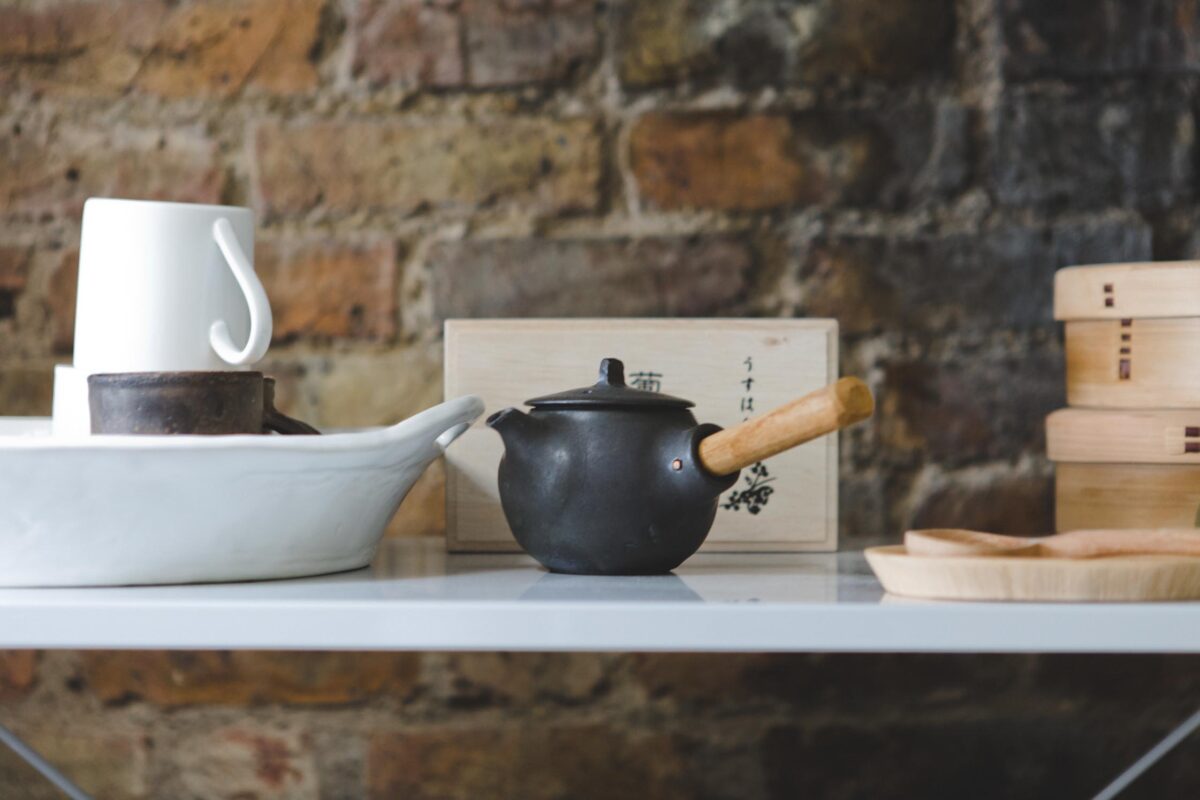 To his left is a glass wall with a view that encompasses the great variety and majesty of London’s skyline—the view is, says Simon, his favourite thing about the home, beyond any interior element. Stretching out in front of him to the right, an intimate living room area merges seamlessly with the refined collection of ceramics and Japanese utensils that define the food lovers’ kitchen space. For those wondering about Simon’s seemingly incongruous mention of door handles earlier in the conversation, that served as the introduction to an affectionate insight into those which he chose for his kitchen cabinets—actually not door handles at all but rather plumbing apparatus put to an alternative, equally effective use. Directly below, the aforementioned bathing area is joined by two bedrooms.