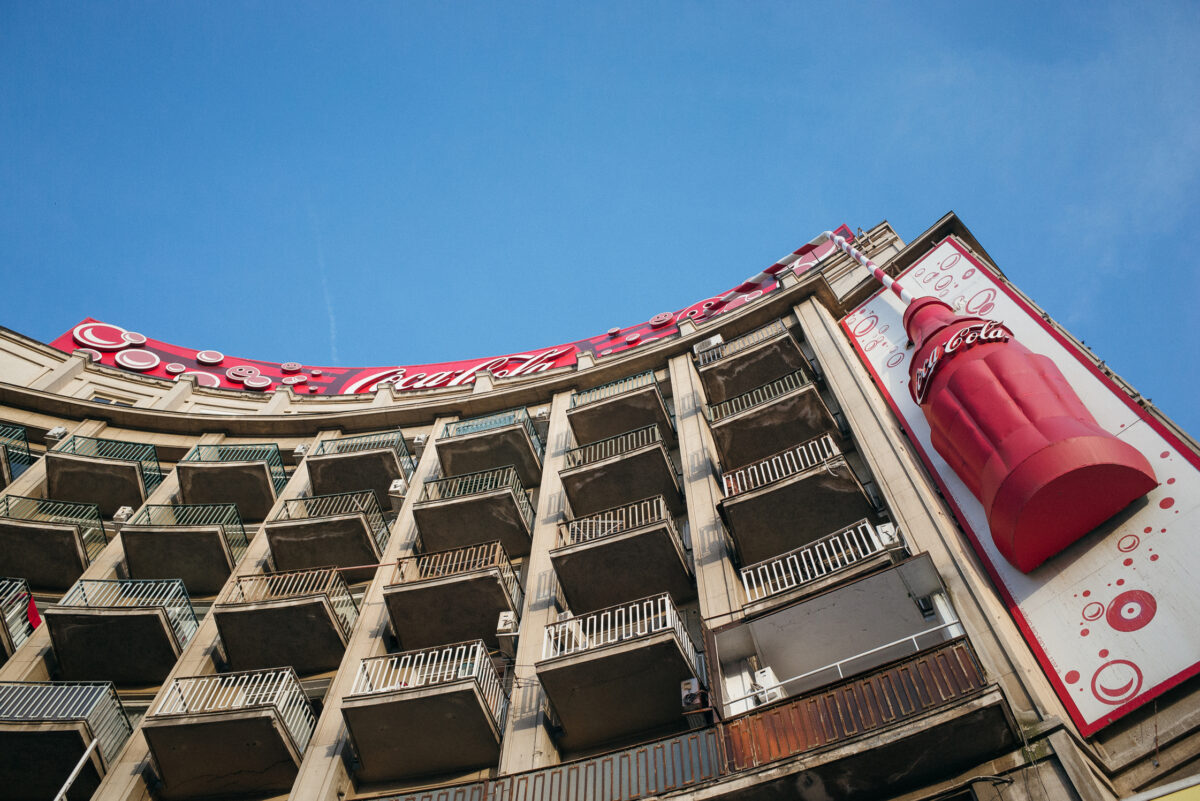 A block of flats on Piața Romană is covered in Coca-Cola advertisements.