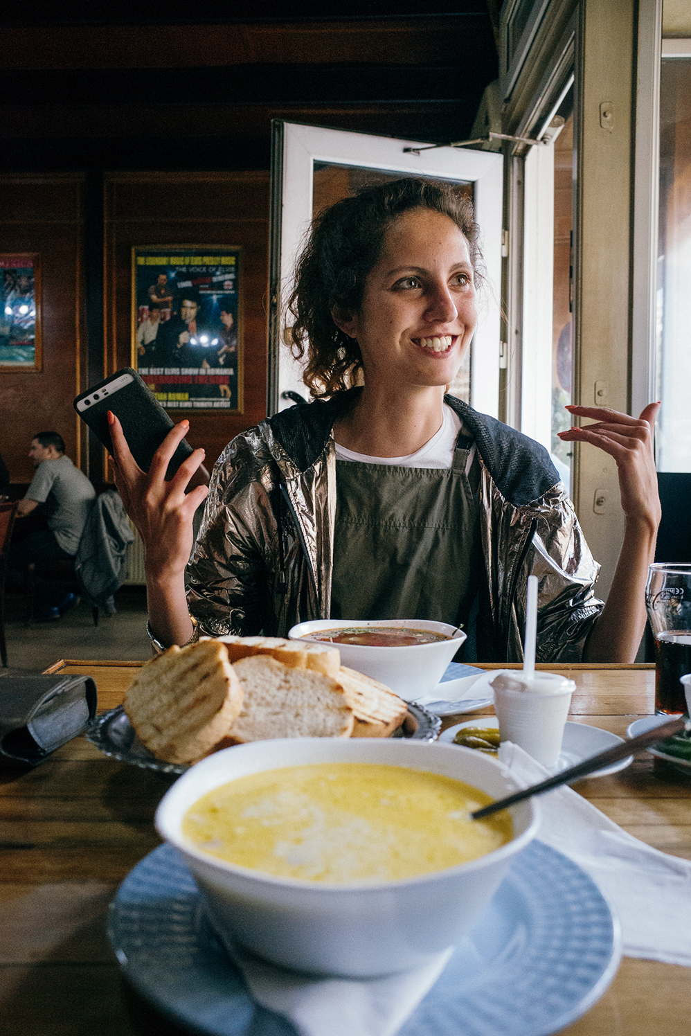 Upon the next destination, both of them are decided: “Tormen! It is closed now, but go tomorrow. It’s just this classic little Romanian bistro, it’s been there for like forty years. It’s been through a revolution! It’s where you meet up after a night out.” Tormen has that homely, authentically tacky vibe to it. 1970s advertisements are hung in frames on the walls; a Coca-Cola sign is lit up in neon red behind the wooden bar; the floors are tiled and a ceiling fan in the corner turns noncommittally . “Here you order Ciorba de Burta, tripe soup. Romanians love it, they say it cures a hangover. It’s made with beef belly, sour cream, garlic and vinegar. I wouldn’t cure my hangover with it.” No—today it’s sarmale, a Turkish dish of cabbage leaves stuffed with rice and meat, meant for special occasions. “At a wedding you eat sarmale, at Christmas you eat sarmale, at Easter you eat sarmale. No matter what the celebration, you eat Sarmale!” Well, nothing to celebrate today, besides another day in Bucharest.