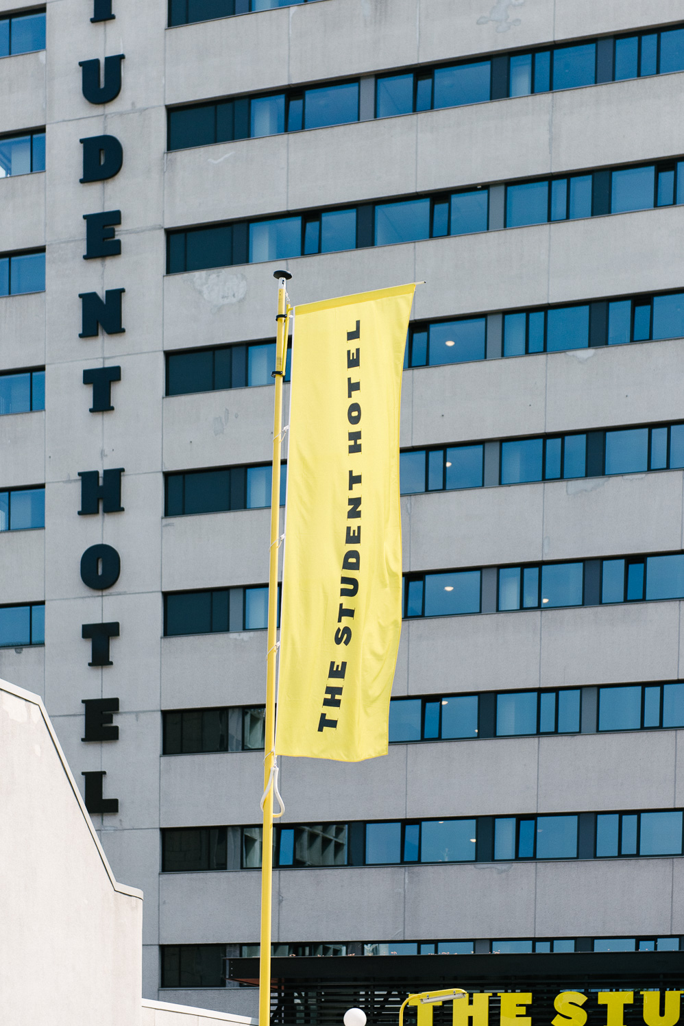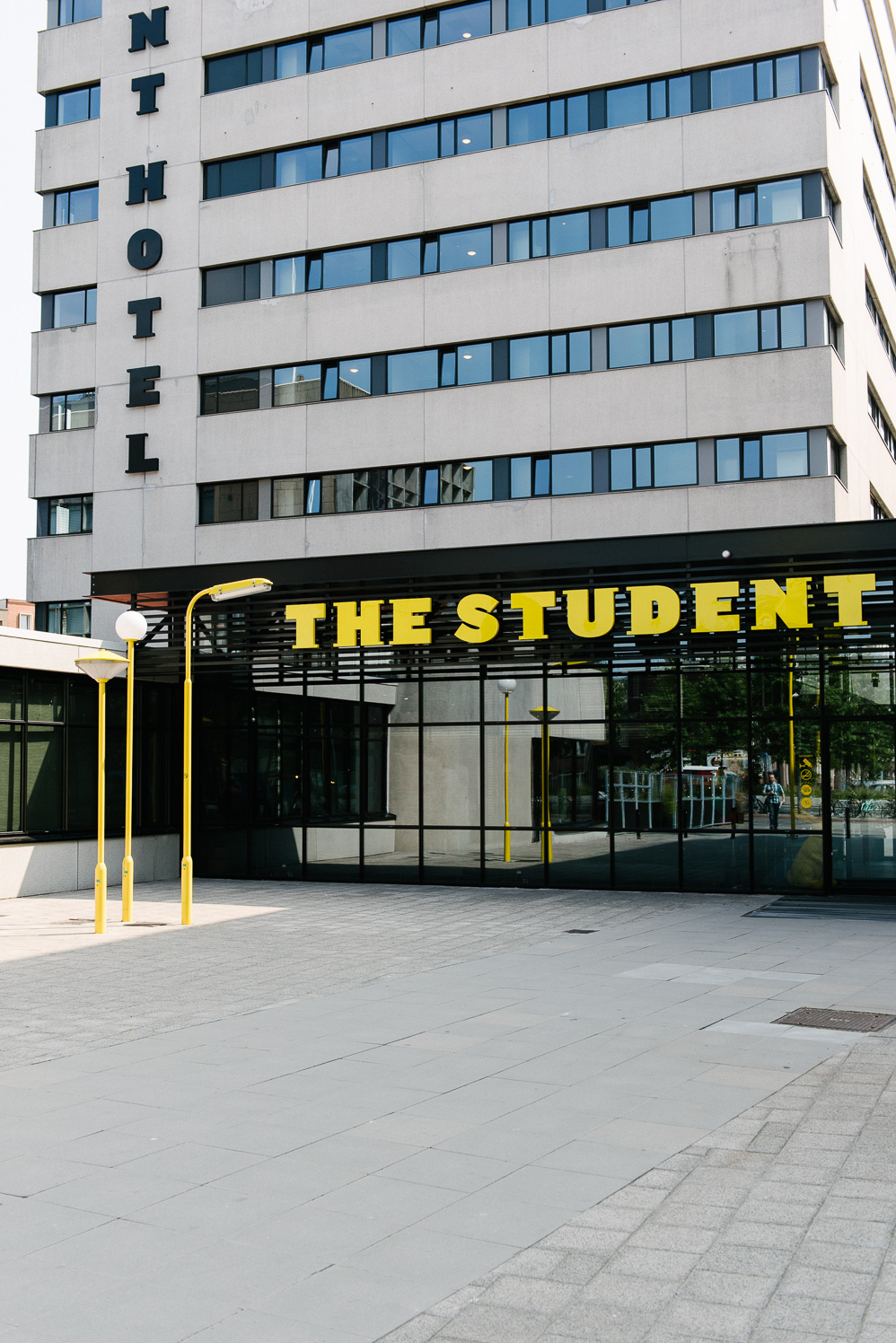 E: Across the street from the Volkshotel is The Student Hotel, a very interesting concept when you think of the question, how can you make every square meter count? Students need housing for a short amount of time, and the city needs hotel rooms to accommodate all the tourists—why not combine the two?