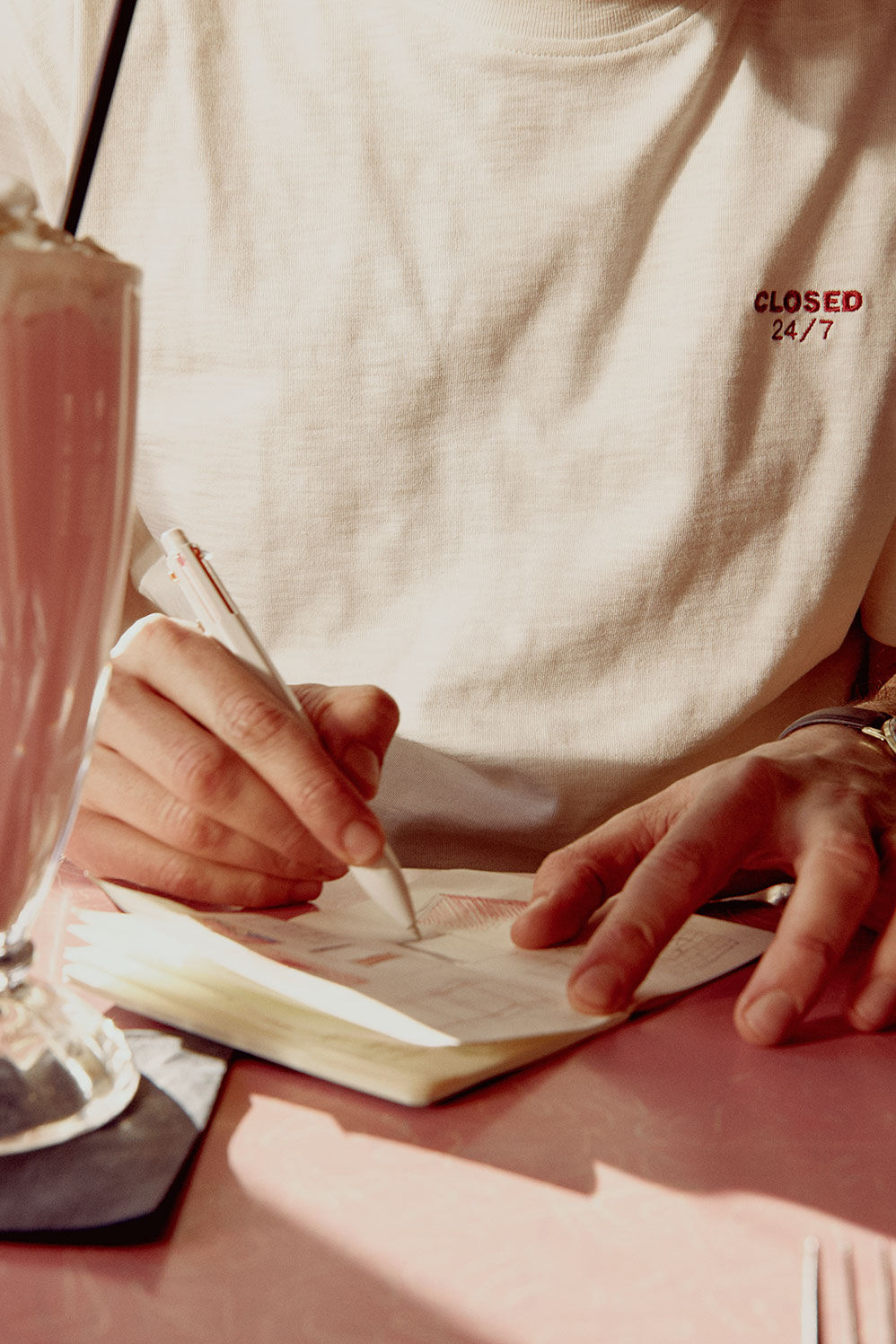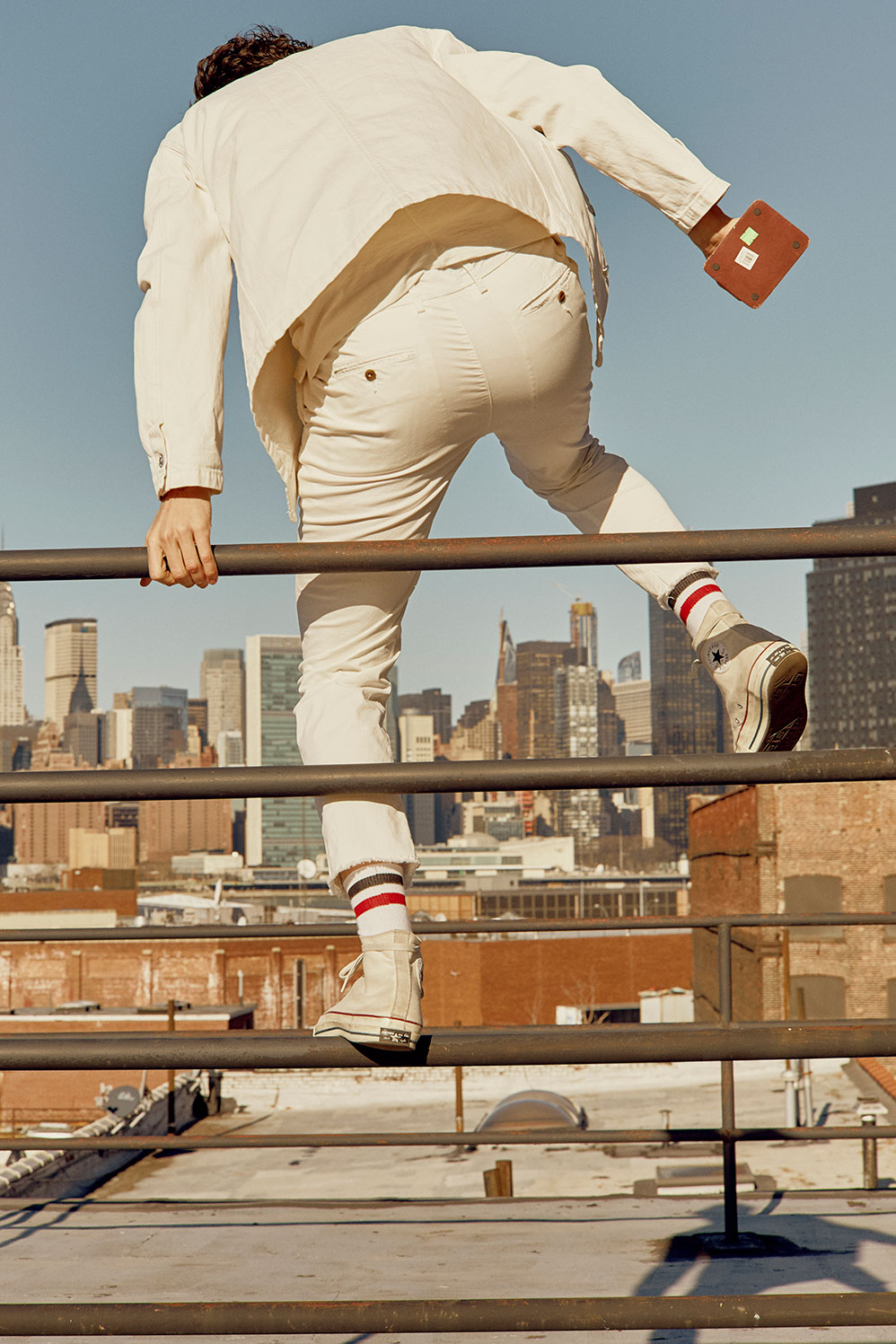 Filkey often draws inspiration from spots similar to this for their ’70s appeal—you can often find him sitting in the window of a diner or a small cafe, gazing at the surrounding neighborhood. Although he sees the pace of New York as great training for his agility, the tumultuous nature of the city can often become overwhelming. He escapes the noise by hopping on his bike or grabbing a skateboard and exploring new neighborhoods, Queens being his favorite borough. “It’s a real jungle of different cities built upon each other,” he says. “Walking down one street you have the feeling you’re in Italy, but turning the corner you’re faced with shop fronts written in Chinese.”