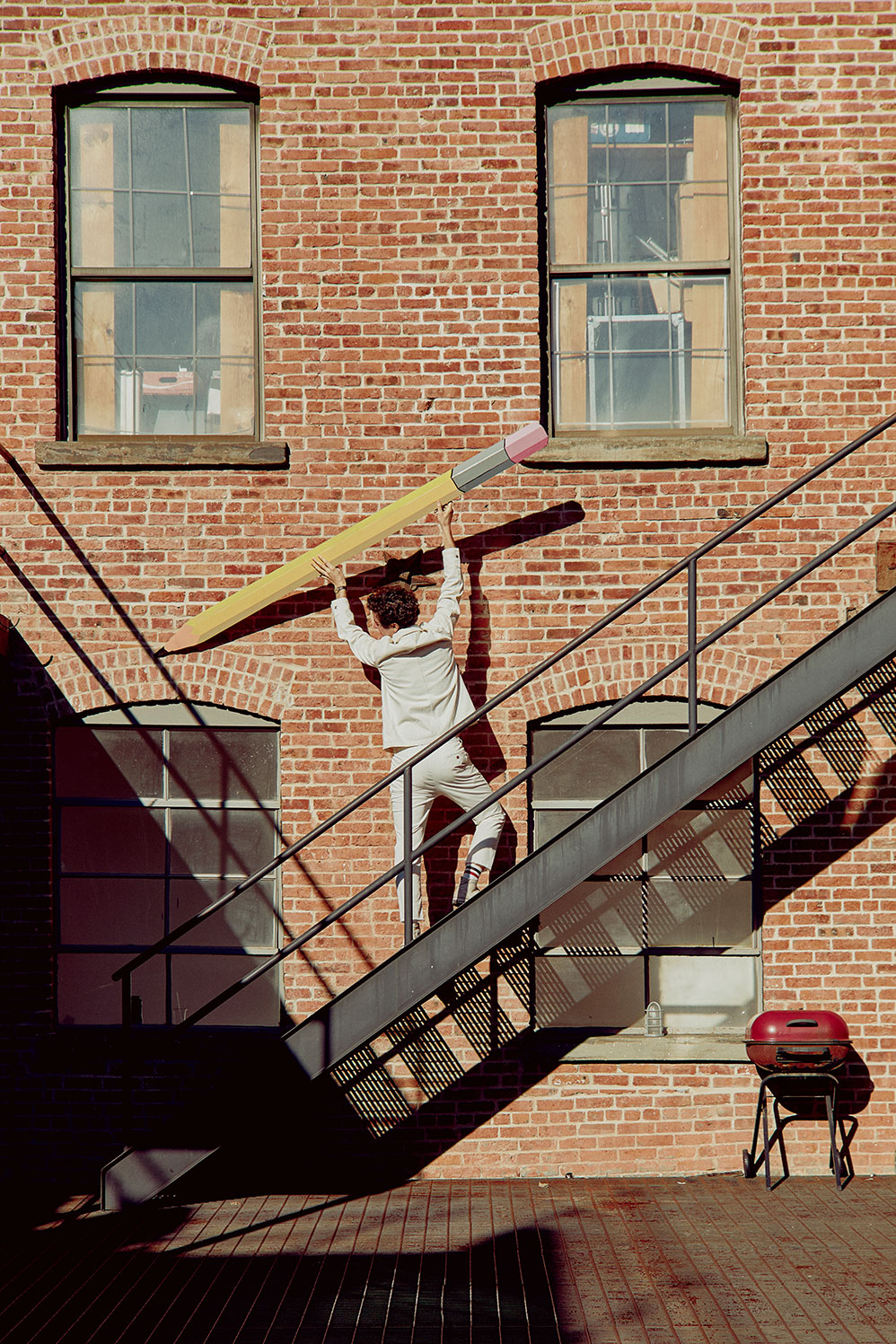 “I usually prefer staying on the opposite side of the camera, so I made a prop to create distraction,” he says, laughing and pointing to the 6-foot-tall pencil in the corner of his sun-bathed living room in Greenpoint. Originally drawn to the hands-on practice of graphic design, he found himself continuously stretching the boundaries of that field to include different mediums such as video and photography.