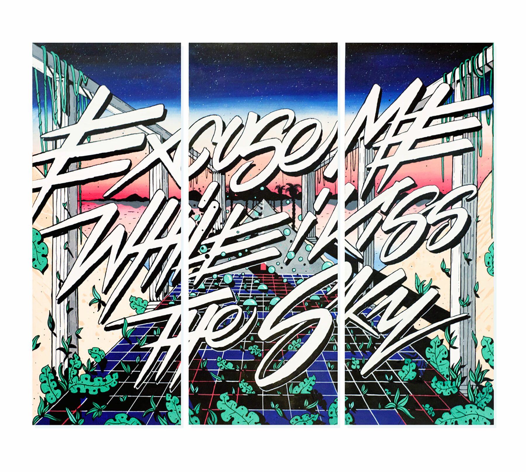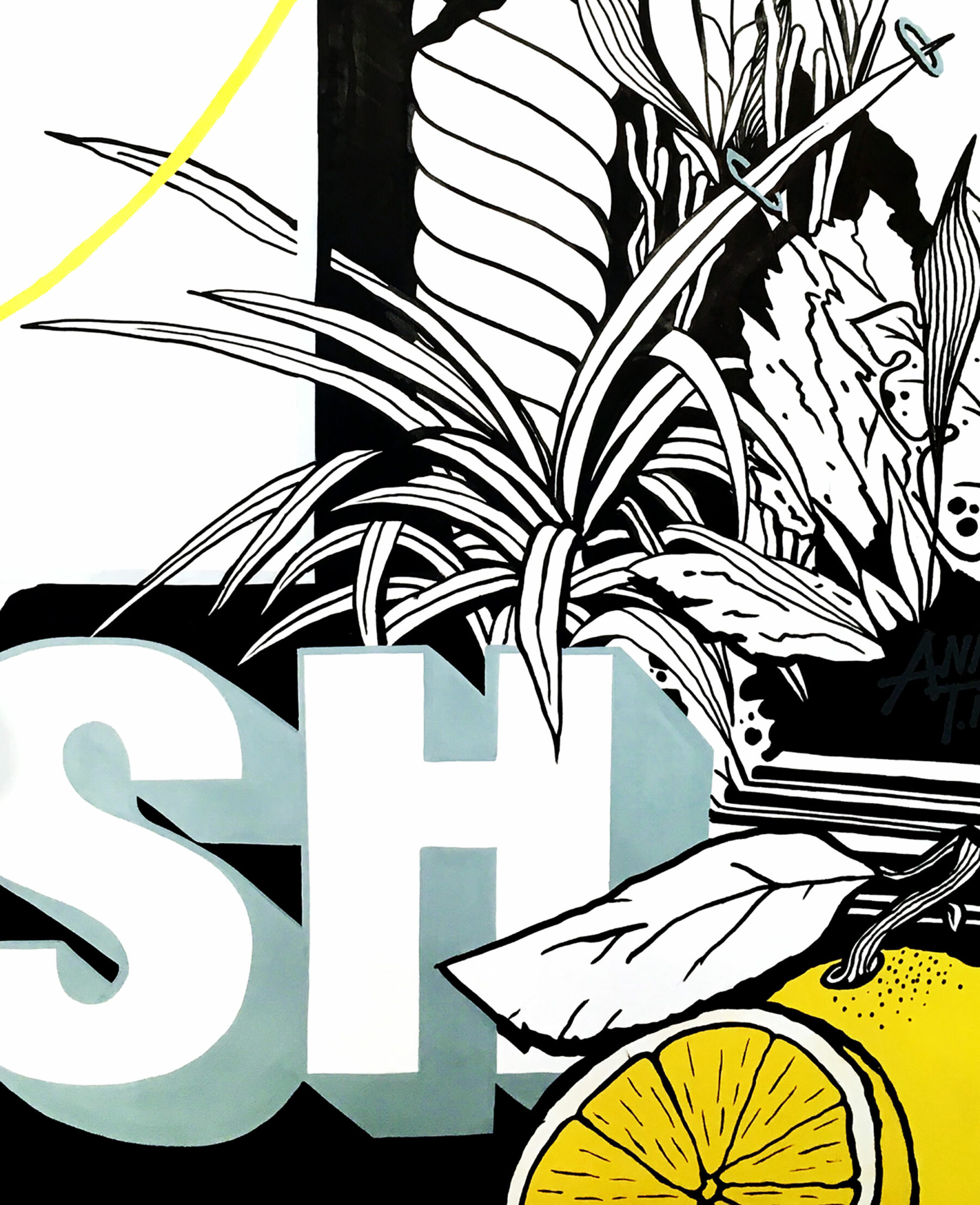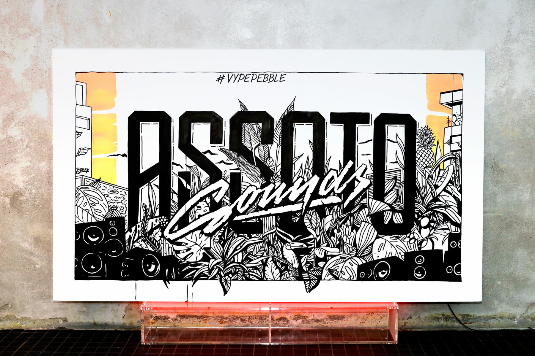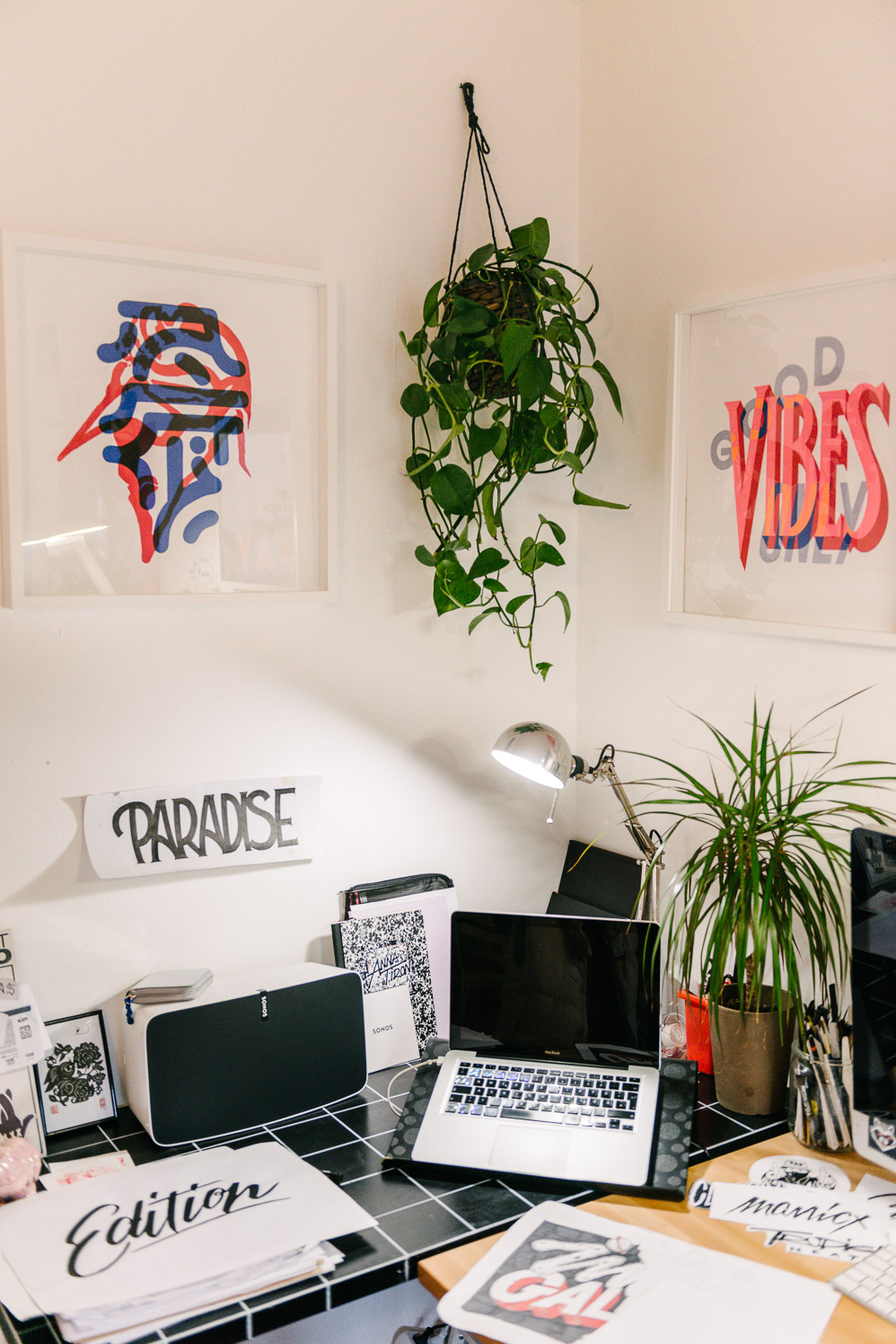 The music that guided her to those first projects remains with her to this day and continues to play a crucial role in her work methods: “There’s always music playing at my place. Good sound quality is of course essential for that. I take in a lot of things through music. I draw words. So, it makes sense that when I’m listening to the music of my favorite artists that a hook line, a quote from a sample or a special vibe may make an impression on me. When the day is crappy and rainy like this one then I like to listen to motivating, tropical music—then it’s ok.”