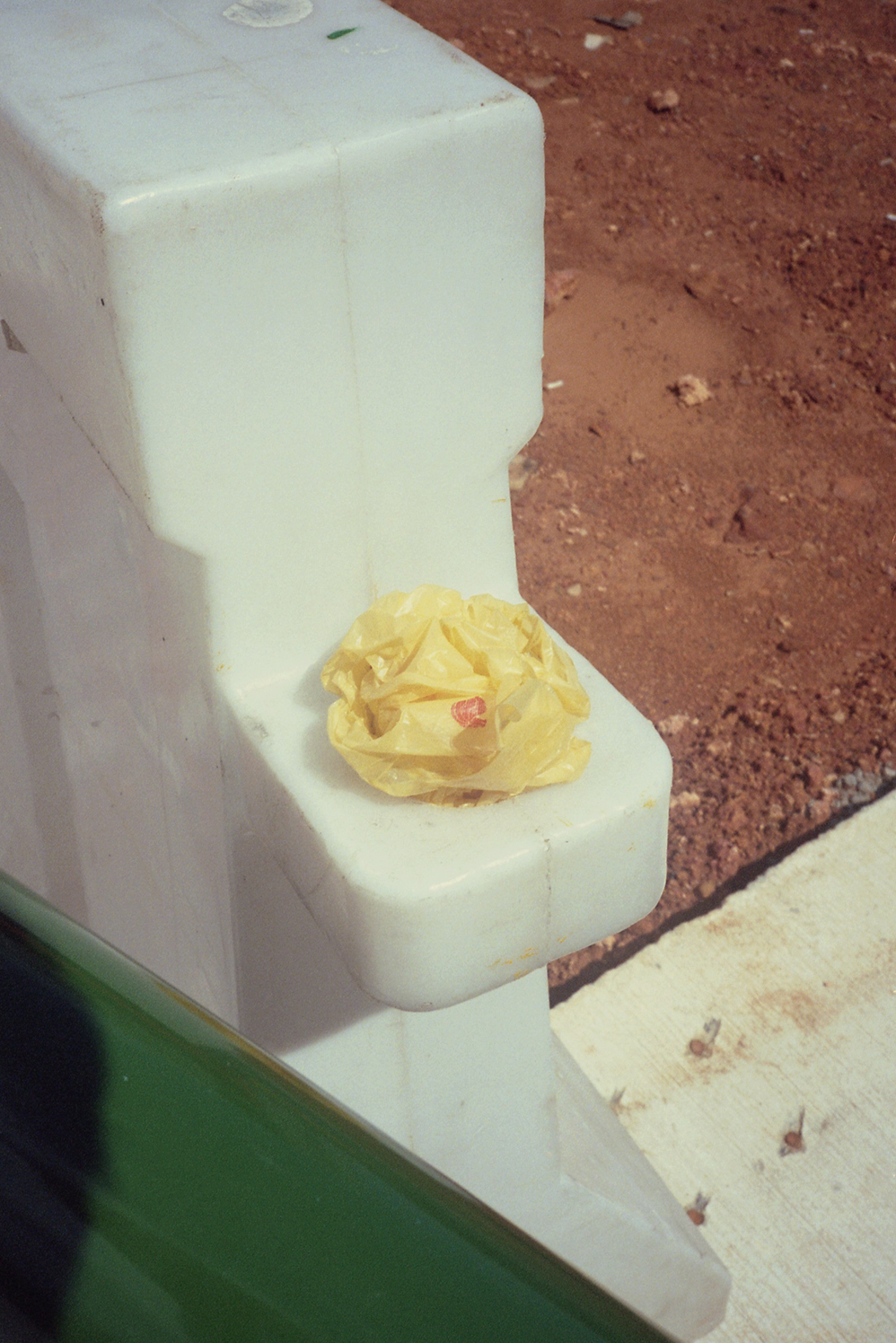 “Though it may come across as banal to some, I find these makeshift, guerrilla-like public sculptures like little joys walking on the street. This one features the iconic Singapore plastic bag (with the lion’s head stamped on it), tucked precariously away into a construction barricade.”