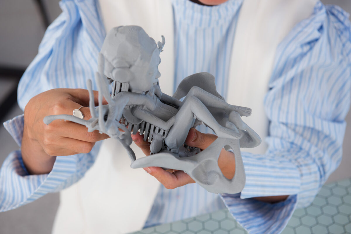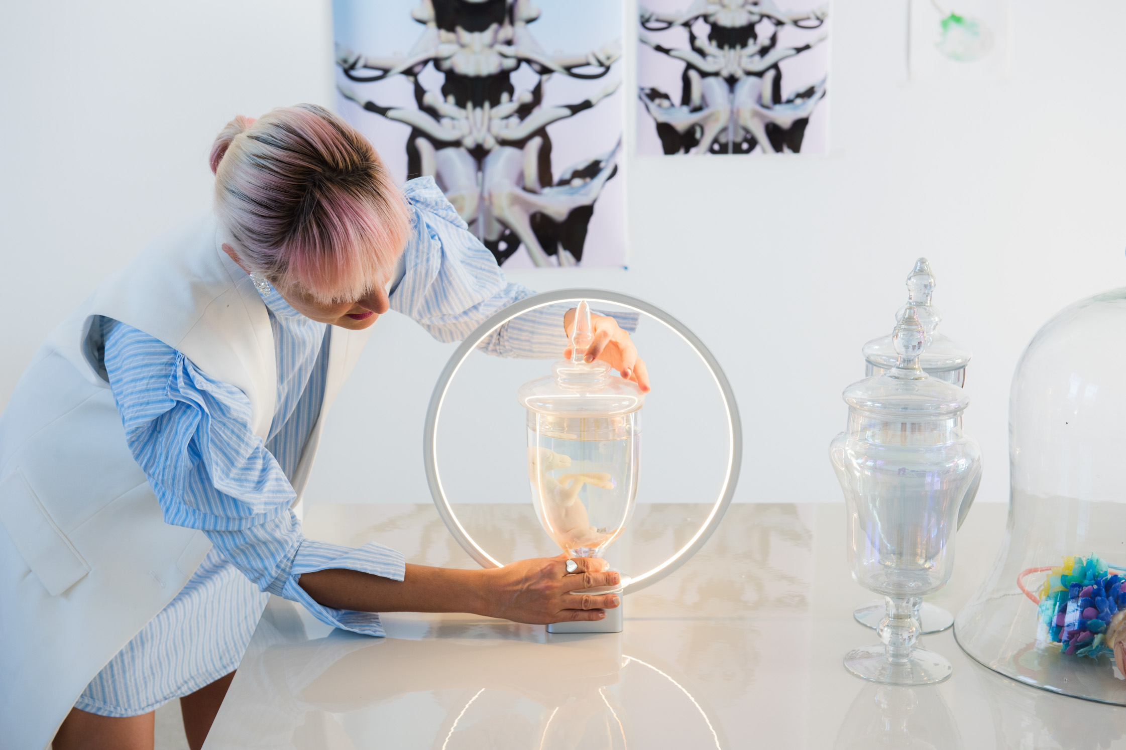 Pinar holding a prototype for one of her Designer Babies: “This one is called Aeon Borea. They have specific gene modifications that allow them to highlight the top nine areas that human beings have expressed most desire for. This one represents longevity and can live up to 150 years. It sits on a pelvic bone.”