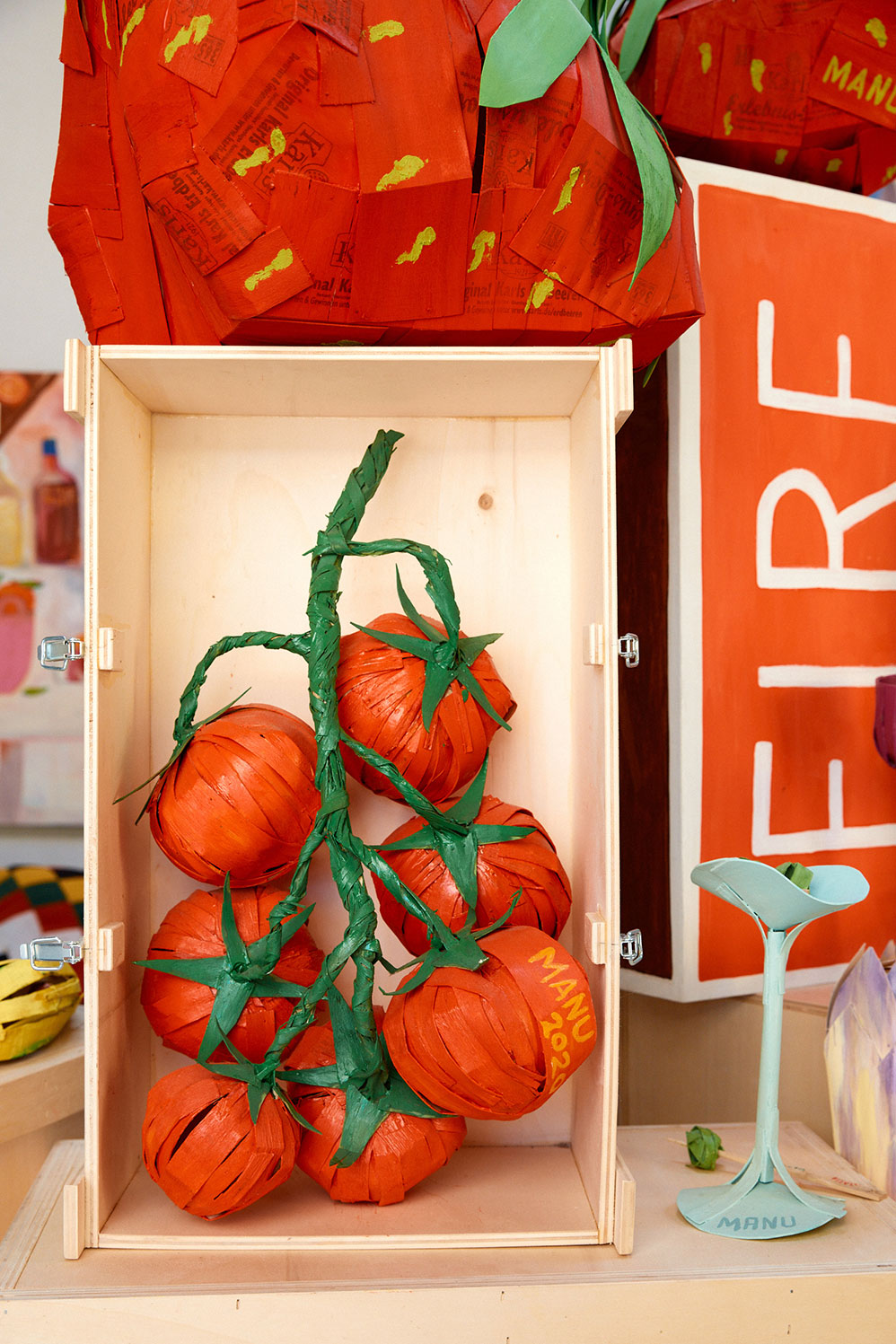 Mainly the space is embellished with their own artworks, but their love for quality and durable designs has led to a collection of pieces imbued with character dotted throughout the studio: a vase fashioned from the inside of a camel’s stomach, soap made with olive oil, a sepia-toned sofa languishing beneath towering sculptures, vintage battered suitcases perched atop the stairs. The idiosyncratic charm of the pieces are reflective of the overall playful atmosphere of their studio. It also underlines their shared interest in sustainability. Manuel’s sculptures are all made with zero waste, and many are notably constructed from fruit and vegetable boxes. Suspended boats of ivory and cerulean trim and bowling-ball sized strawberries alike are constructed with this particular wood. Manuel prioritizes creating art which can coexist in harmony with nature: “You are an artist, you are so free, you can do whatever you want, use the material you want…and still [artists] produce so much trash.”