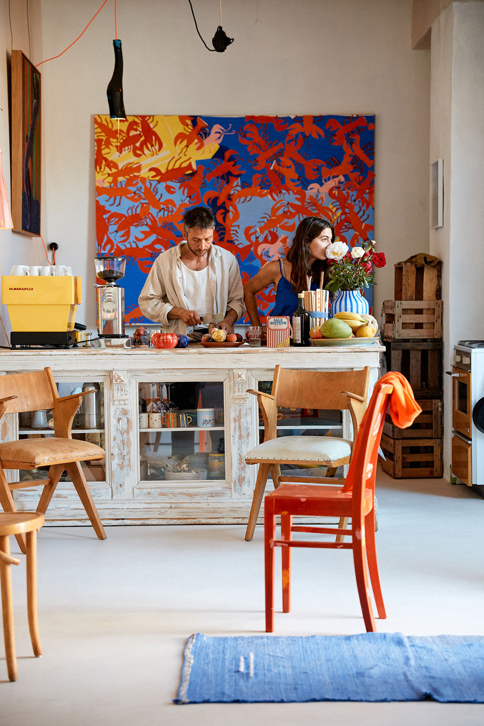 Johanna, originally from France, typically uses oil paints, working with vivid, dramatic colors on expansive canvases. Manuel is a sculptor from Eckernförde, who creates vibrant sculptures of boats, sea creatures, and sumptuous-looking, oftentimes larger-than-life fruit and vegetables. Serving as a space where their practices can exist in a nurturing, symbiotic relationship, their studio is a uniquely immersive environment.