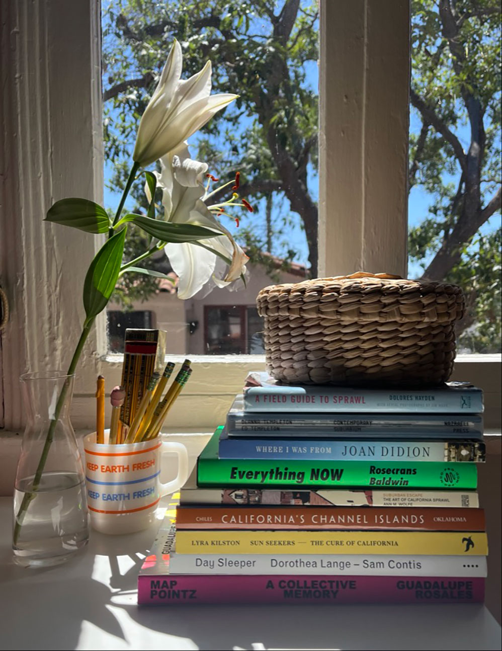I moved to LA in 2021 and since being here I created a self-assigned reading list to better understand the city. I am now making my way through a stack of books and ephemera on my desk about Los Angeles including Sun Seekers, Into the Sunset: Photography’s Image of the American West, Judy Chicago: Los Angeles at Jeffrey Deitch Book of Postcards, and Los Angeles Standards. I also have a set of framed postcards from Dia Beacon of Lighting Fields which I was lucky to visit last fall. The postcards act as a helpful reminder of the big open field in the desert and a welcomed contrast to whatever is happening over email or in the busyness of everyday city life.