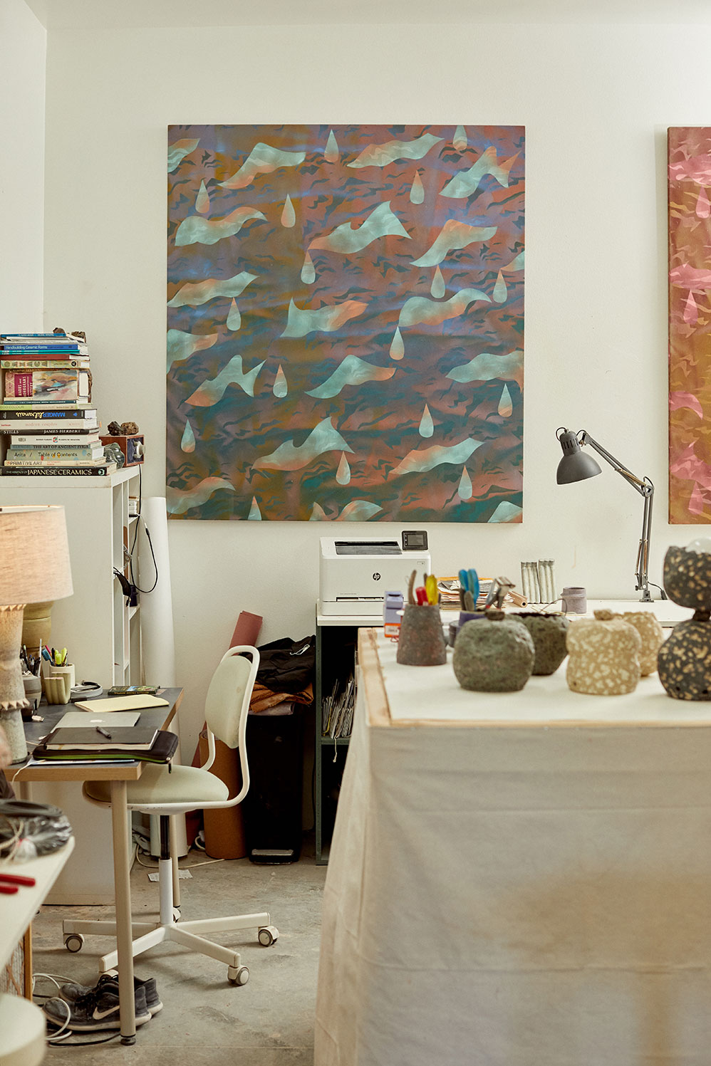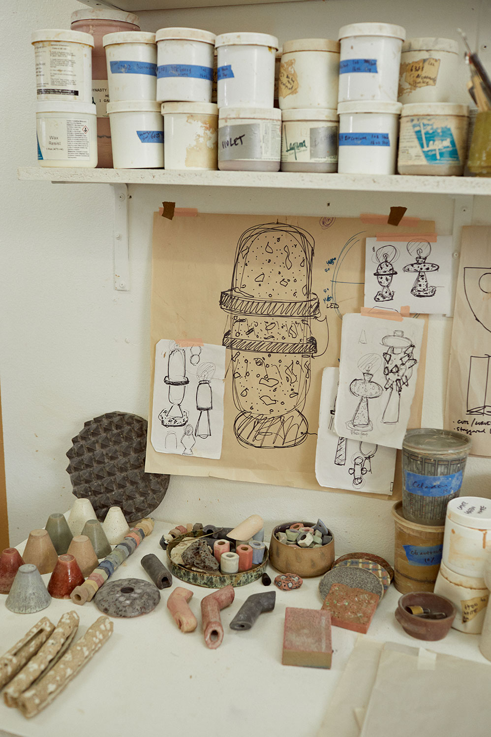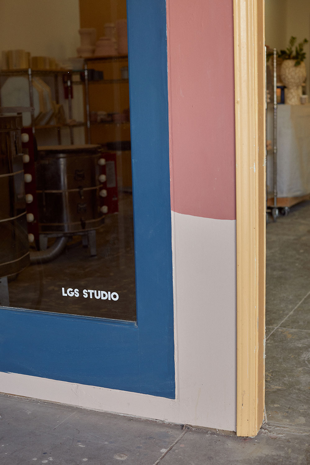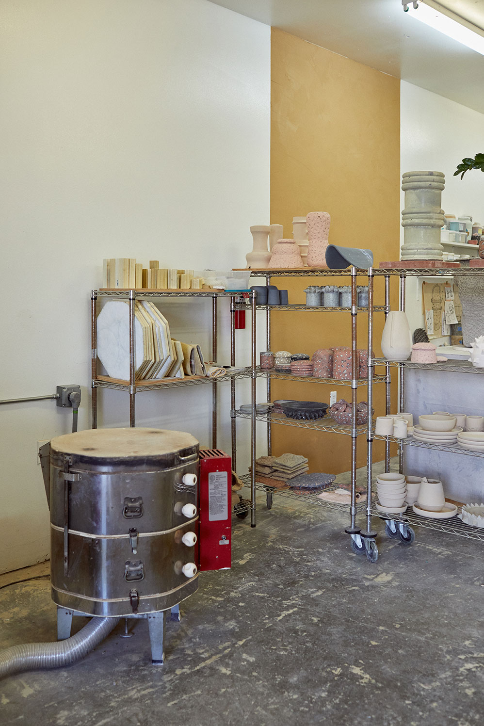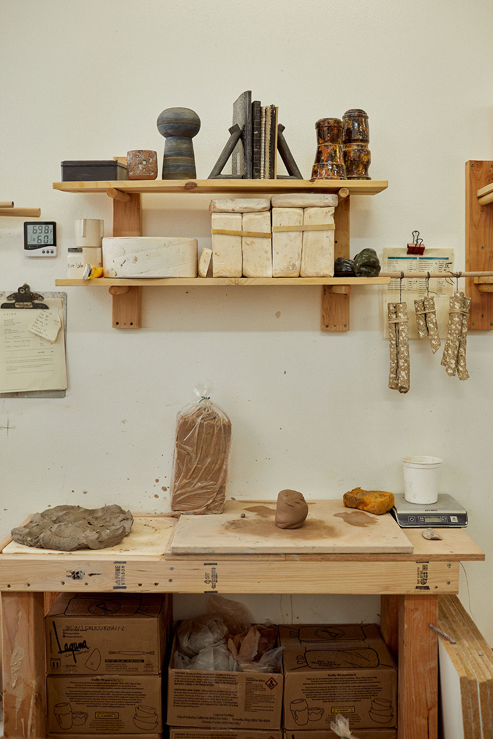 After La Colombe, the pair leads us to the Glassell Park studio they’ve occupied for about a year. A metal gate rolls back onto a parking lot shaded by gnarled citrus trees and we head towards the former warehouse. A canary-yellow door marks LGS’s ground-floor space, where kilns and a wheel sit adjacent to glaze-flecked work tables filled with unfinished forms, pots of pigment, hefty blocks of clay, and sketches of burgeoning ideas. Next to one desk, a stack of reference books bears titles like The Art of Ancient Syria, The Heritage of Japanese Ceramics, and Oaxaca.