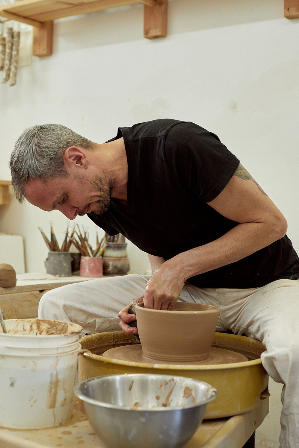 While Renaud takes the lead on all wheel-thrown work, they “hand build and finish things together,” he says. “[Each piece] usually goes through a few rounds of back and forth. Noel will express to me what he sees in the work, and how he thinks it could evolve. Nine times out of 10, working through those ideas with him, we usually come to a place where a piece comes out of the kiln and we set it down on the table, he continues. “When we look at something and we don’t see areas we can improve upon, that’s when it feels most finished to us.”