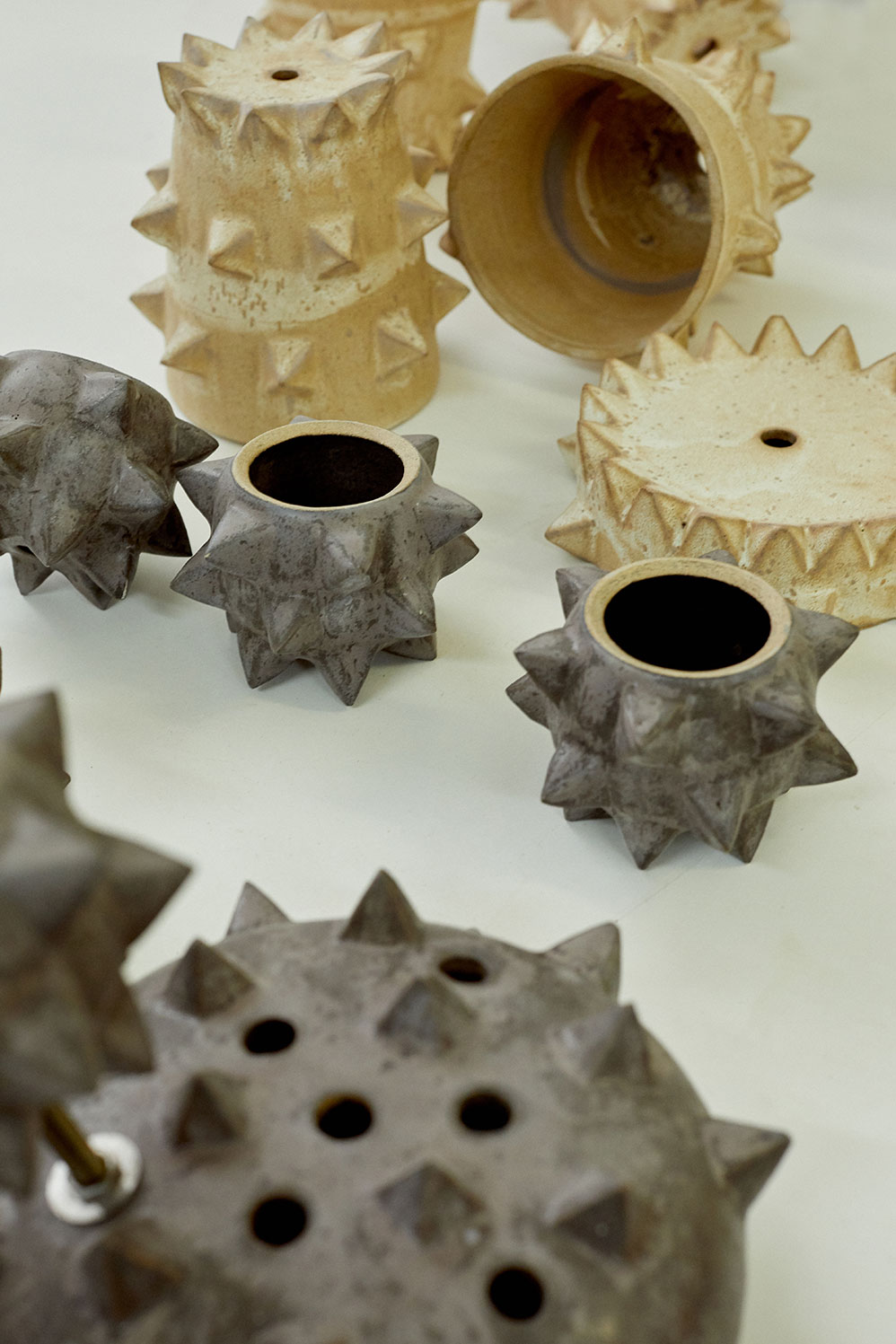 Renaud points to the Studded Collection, which they see as a punk extension of Ridge. Arrangements of small, hand-molded pyramids stud the surfaces of vessels and light fixtures of varying sizes. Depending on the pattern, they loosely resemble sea urchins, S&M gear, medieval weaponry, or ritualistic Mayan urns. The line has become synonymous with LGS’s brand, fusing aesthetics of rebellion with a nod to nature and the long, rich history of art.