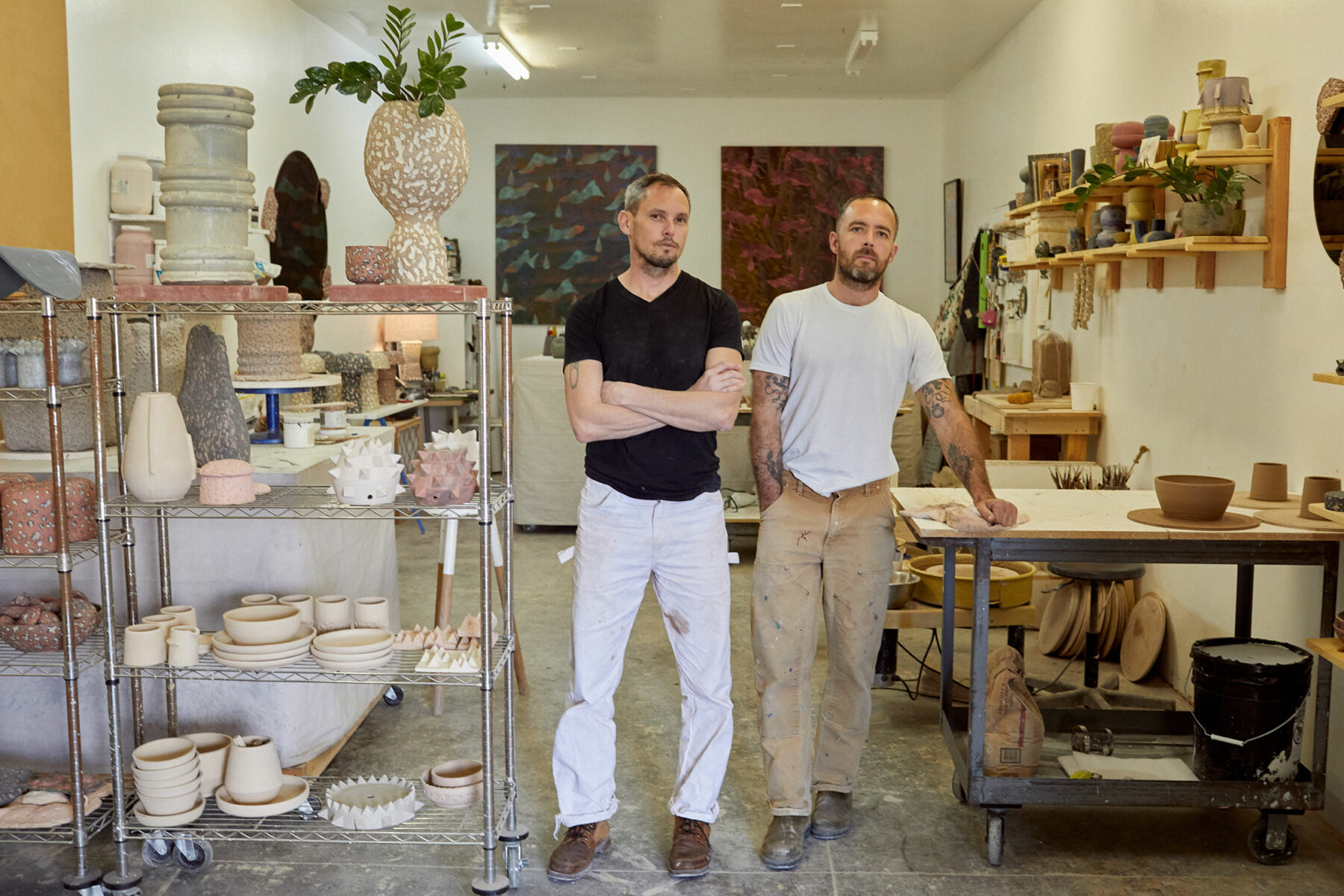It’s supposed to rain—pour, actually—the day Noel Hennessy and Thomas Renaud give us a tour of their Northeast Los Angeles ceramics studio, LGS, where they meticulously shape and refine their studded, intricately carved clay vessels. But the sun is breaking through when we meet them in Frogtown, a strip of Craftsman bungalows and sprawling warehouses that lines a surprisingly lush tract of the Los Angeles River.