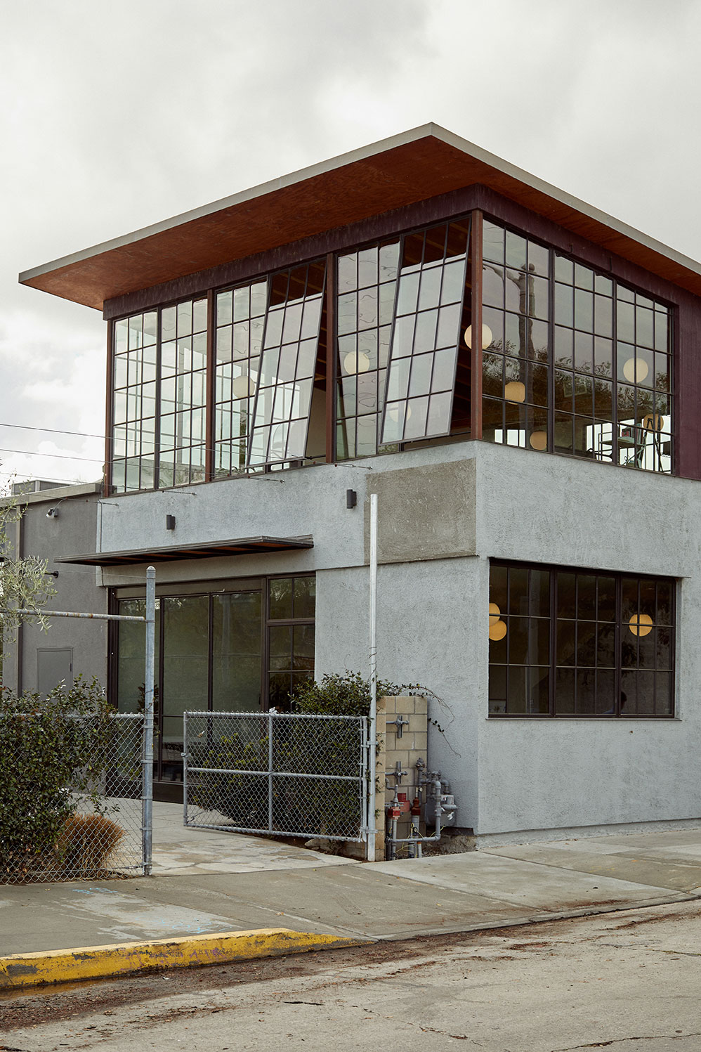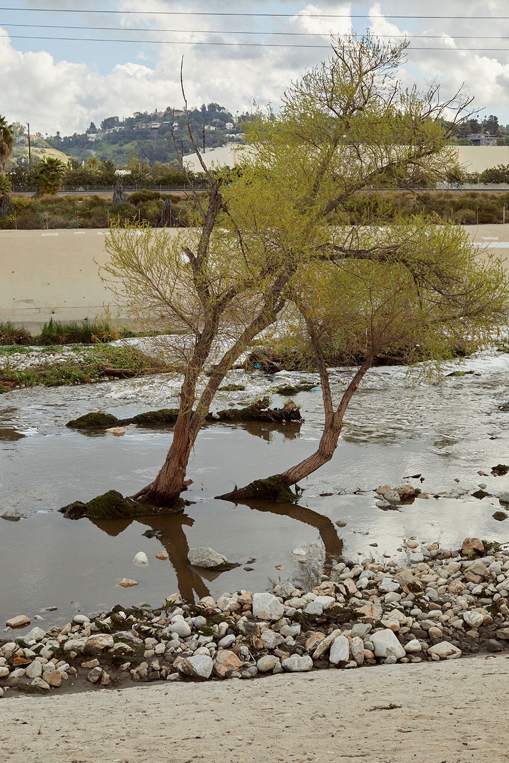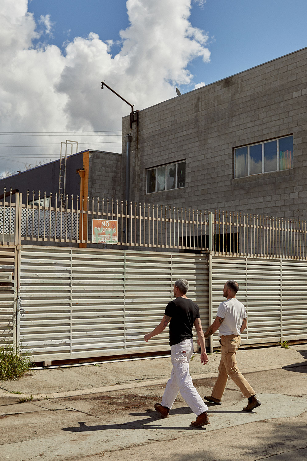 The LA River cuts south through the city’s east side, running from the base of the Santa Susana Mountains, through Downtown LA, and clear to its mouth at the oceanside town of Long Beach. In 1938, the river was paved to quell flooding. But since then, its waters have pushed through the concrete, creating islands of dense growth and pools filled with sundry fish, bullfrogs, and cormorants. Hennessy points to a blue heron as it glides over a factory towards an especially overgrown tract of the basin. “You’ll see some of the work that we’re doing is inspired by nature,” he says, watching the bird dive for breakfast in this unlikely location. “But it’s industrial and brutal, too. We like that balance.” Renaud adds, “and how the two play off of one another. The LA River is an example of that—a man-made element being reclaimed by nature. You’ll see some of that in the work we do.”