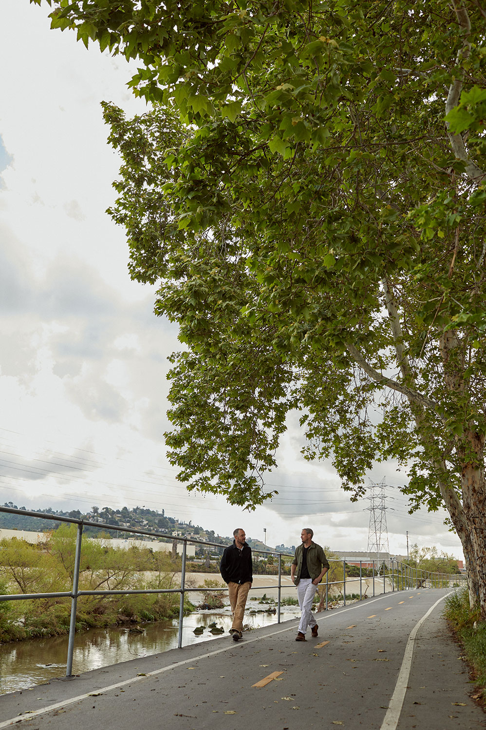 Noel Hennessy and Thomas Renaud walking along the Los Angeles River.