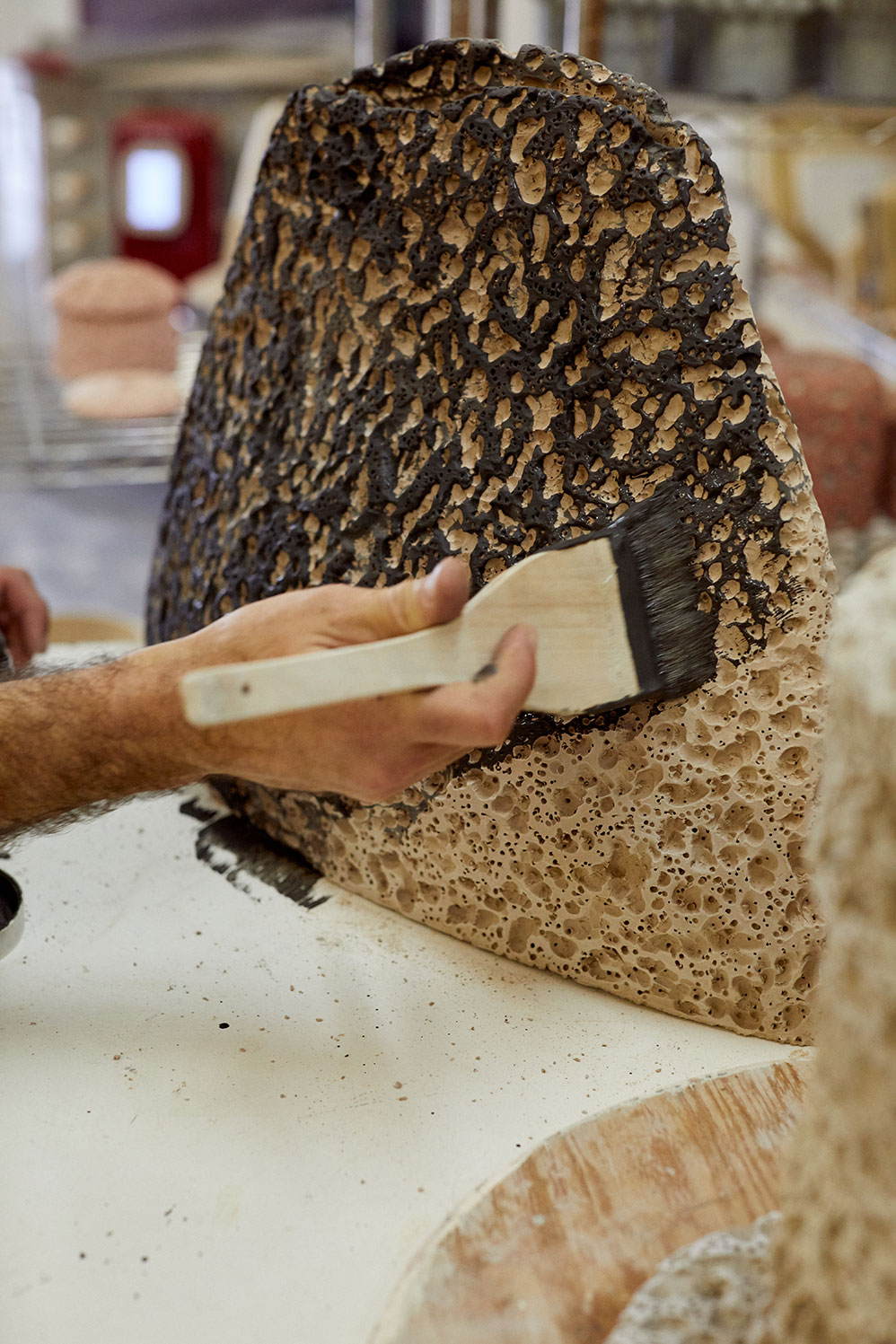 Tephra, their newest series, draws from similar impulses but materializes quite differently. Instead of adding to these forms, Hennessy and Renaud subtract by carving hundreds of small, irregular divots across their surfaces. The individuality of each mark is important to the duo: “Even if a silhouette is similar [to another piece], I know that I have something that was physically carved by hand and is therefore unique to me,” says Renaud, of the process that informs Tephra. “[Collectors] are investing in what we’re doing, and I think it’s really important that they have something unique to us and that can inspire conversation.”