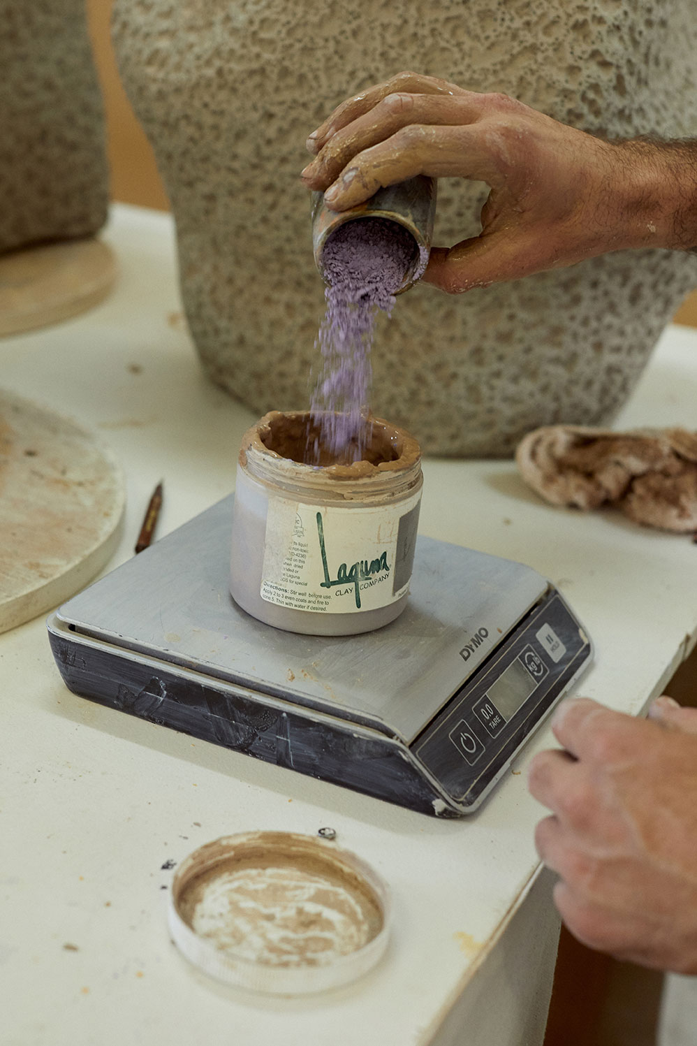 LGS’s first collections emerged here, and set the tone for both their process and aesthetic. For an early collection of tableware called Ridge (which they continue to make and refine), Renaud threw vessels with thick walls and smooth curves, then handed them to Hennessy, who added hand-molded accretions: triangular ridges that hug contours and double as subtle handles. The palette they chose—a mix of soft crimsons, velvety lavenders, and speckled grays—recalls raw gemstones, bedrock polished by centuries of rain, and brutalist interiors like those of Lina Bo Bardi’s 1982 SESC Pompeia in Sao Paulo.