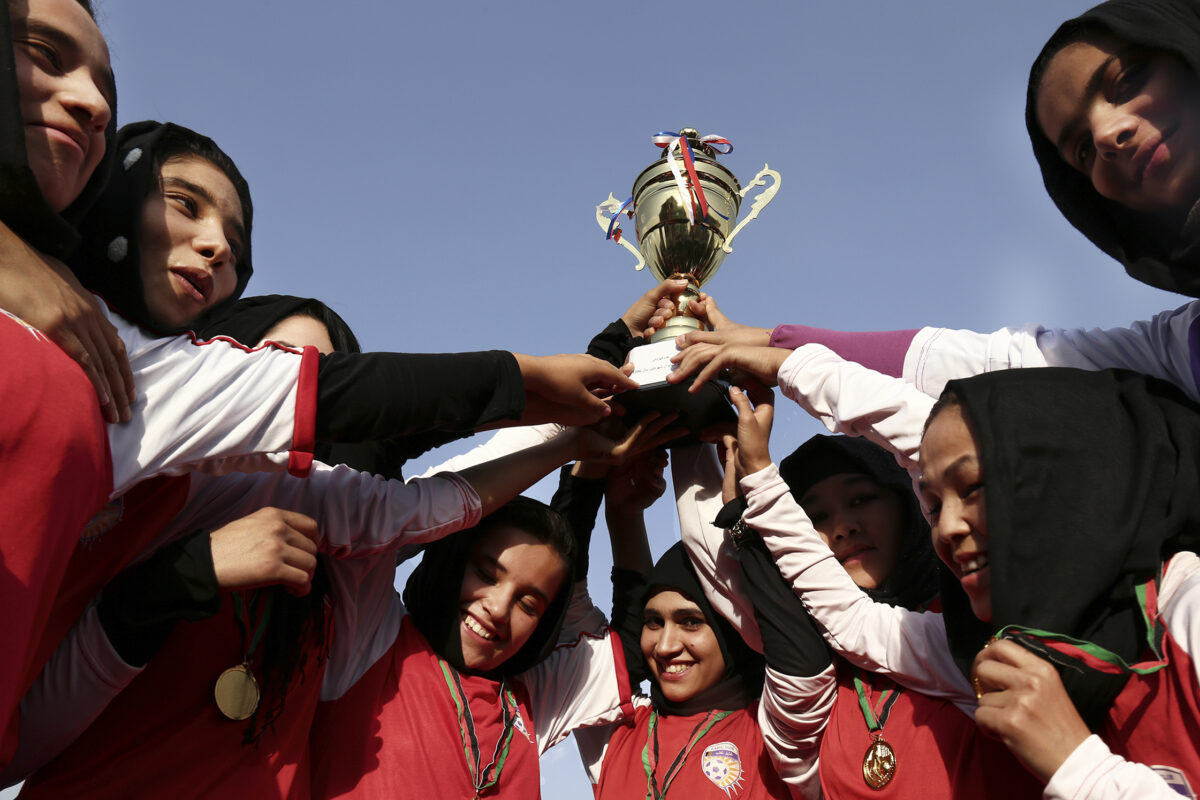 The women’s team of Kabul FC during the victory ceremony of the league game, stage of the AFF in Kabul, August 2017, Afghanistan, Asia