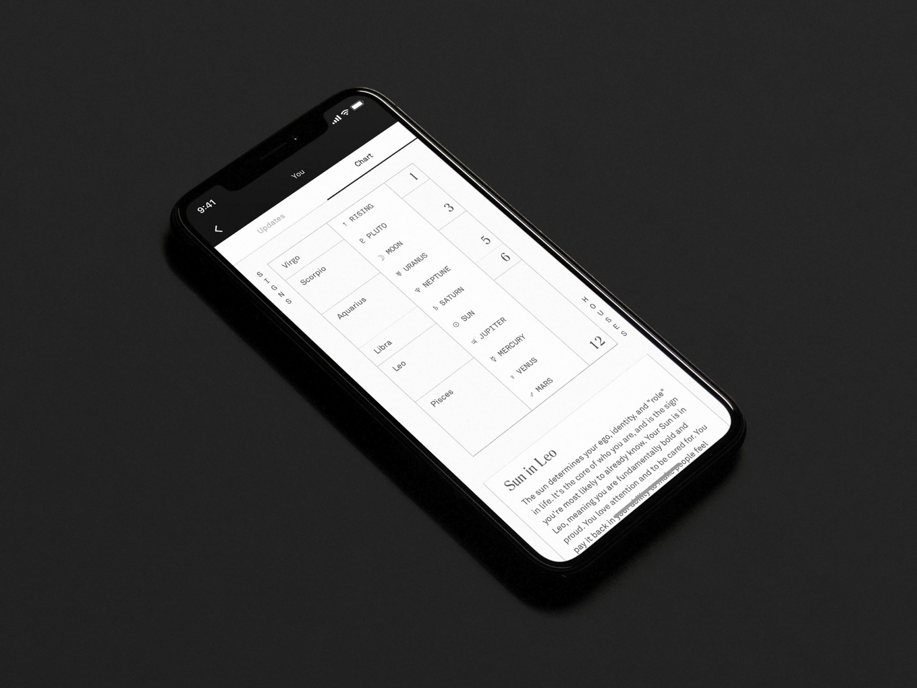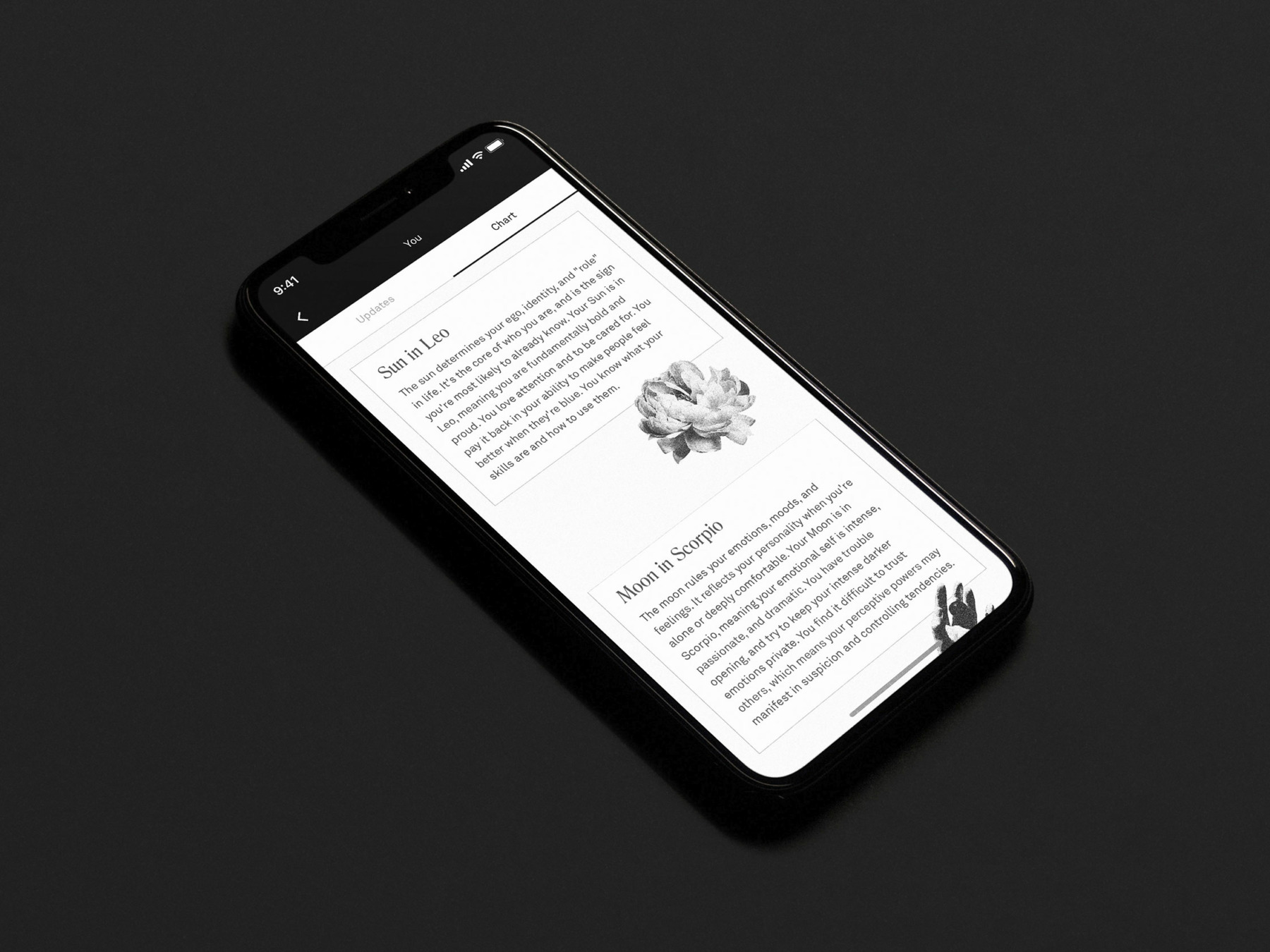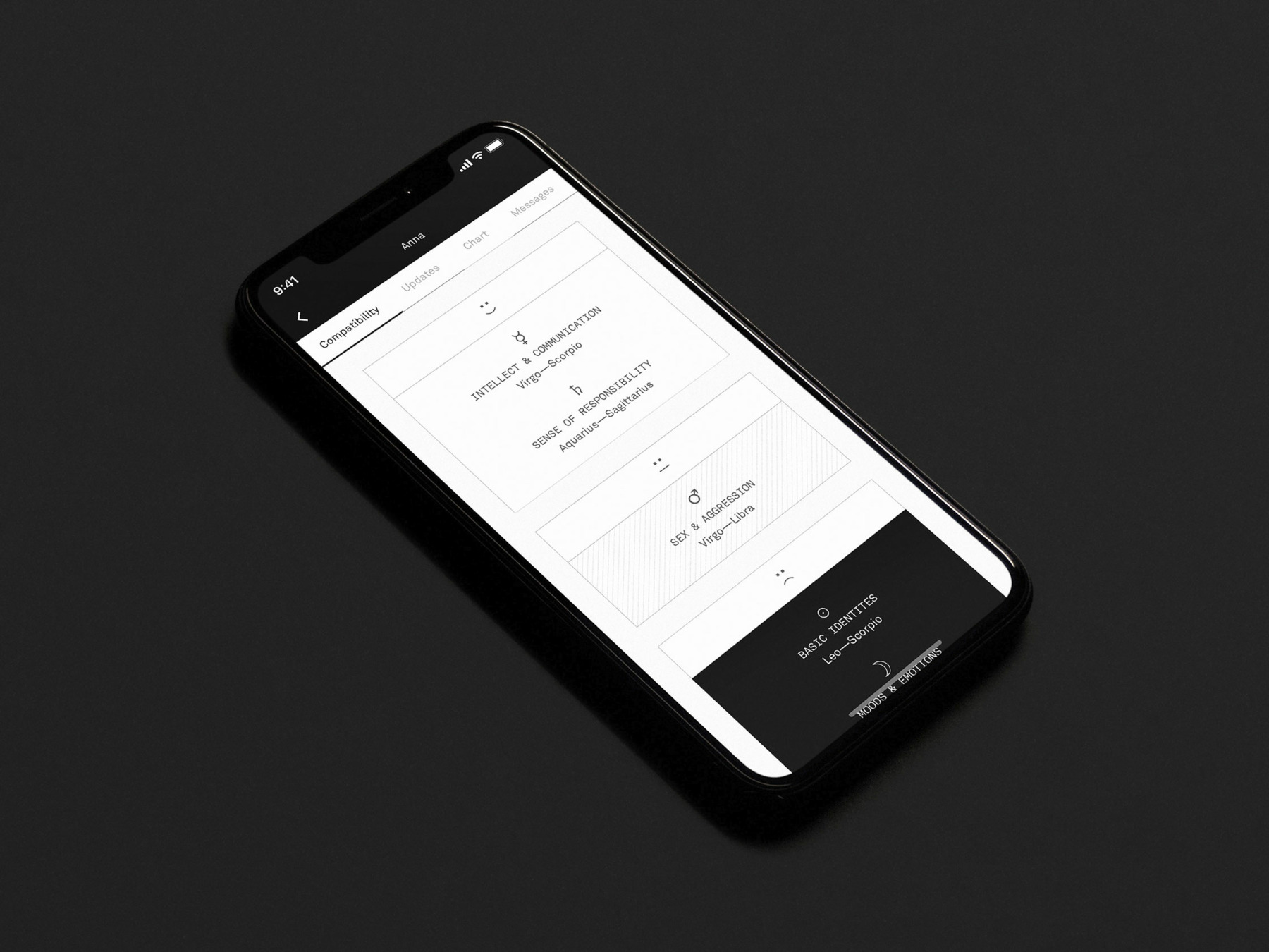 Unlike more classic horoscope columns, Co-Star is highly personalized, delivering evocative predictions as well as mysterious hints, and bite-size wisdom (based on your time and place of birth) directly to your phone screen. Artificial intelligence plays a huge role in compiling the guidance. “Everything is based on planetary movement, using data from NASA” Banu explains. But design is just as important. “We try to honor that emptiness of space with stark surfaces and negative space, and the richness of all that punctuates that darkness with delicate features, tactile textures, and abstract graphics. There’s a tension between old and new, showing the hand but operating within the slick and technocratic.”