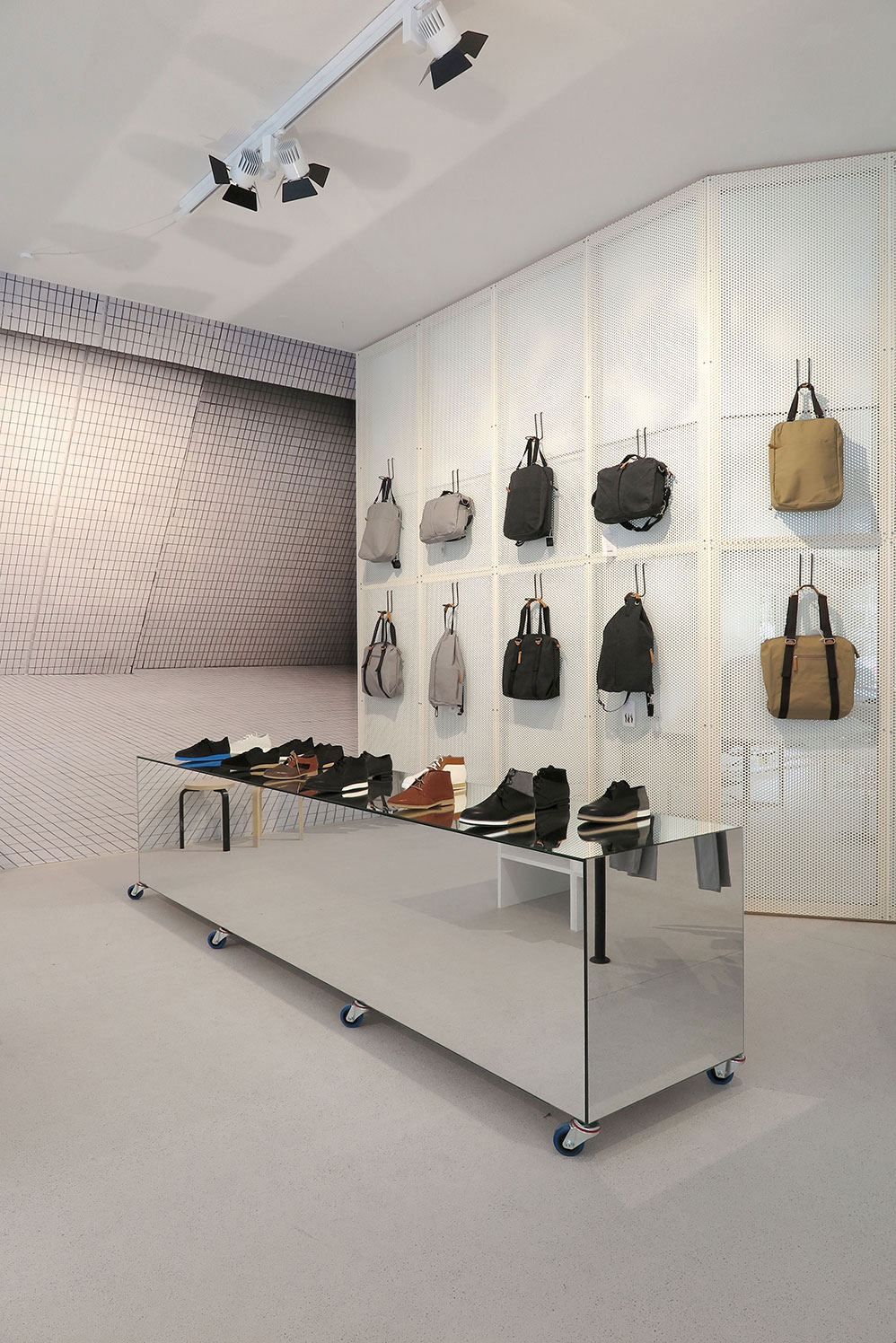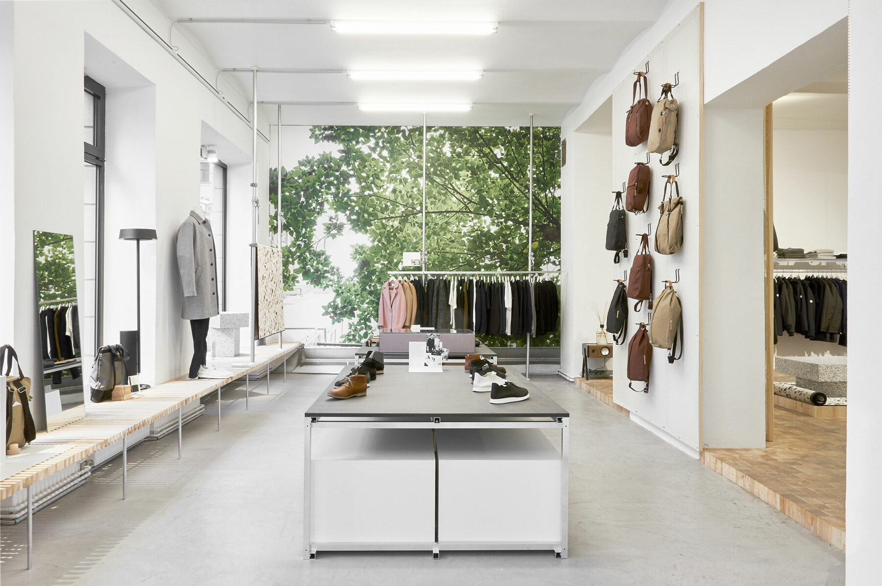 The stores are also physically adapted to fit the overall concept. The configuration of the store and the display arrangements were designed and purpose built by Christian Kaegi and his partners. The flexible and minimalist look mirrors the products themselves. The resulting aesthetic is reminiscent of pieces of art on display in galleries—a world away from off-the-rack goods.