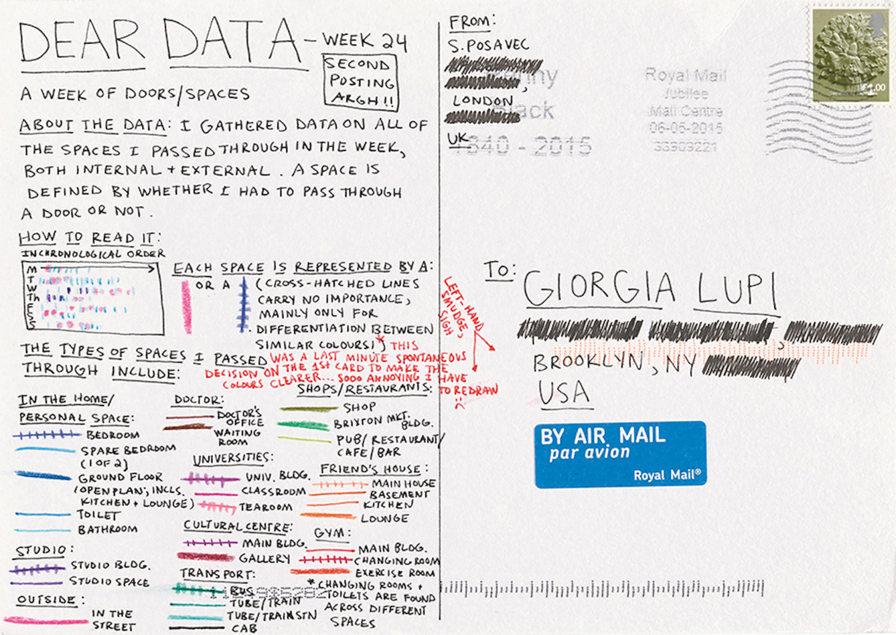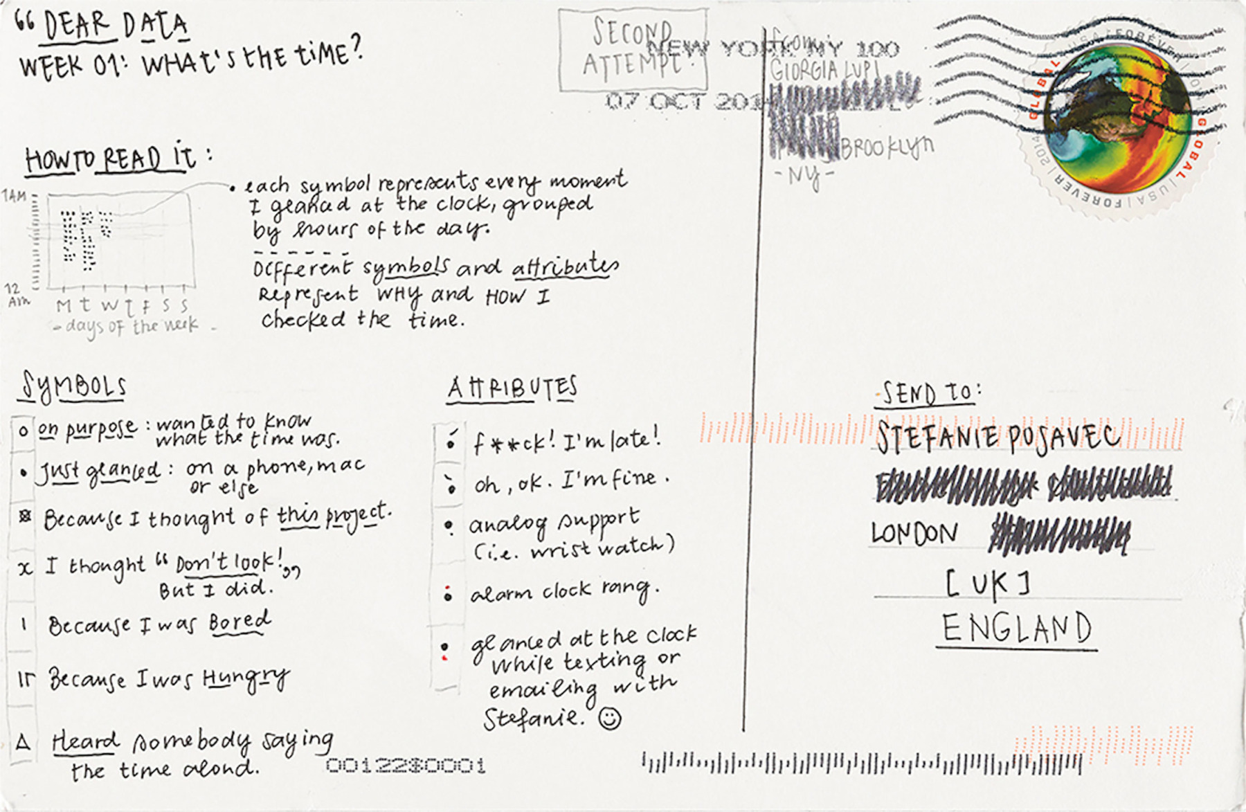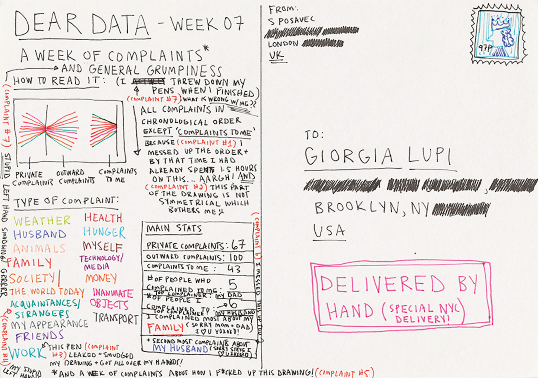 For Lupi, data is a means of storytelling. But it’s not just grand narratives she’s looking to represent, her work illustrates smaller personal histories too. For her project Dear Data, she teamed up with artist and author Stefanie Posavec and the two exchanged postcards every week for a year, with Lupi sending hers from her home in New York to Posavec in London. Their colorful drawings tracked things like the number of times they had laughed that week (and what sparked it) or how many times they had said goodbye. “In order for data to be faithful to human nature, we have to recognize what numbers really stand for,” says Lupi. “And in many cases, that’s our messy and unpredictable lives.”