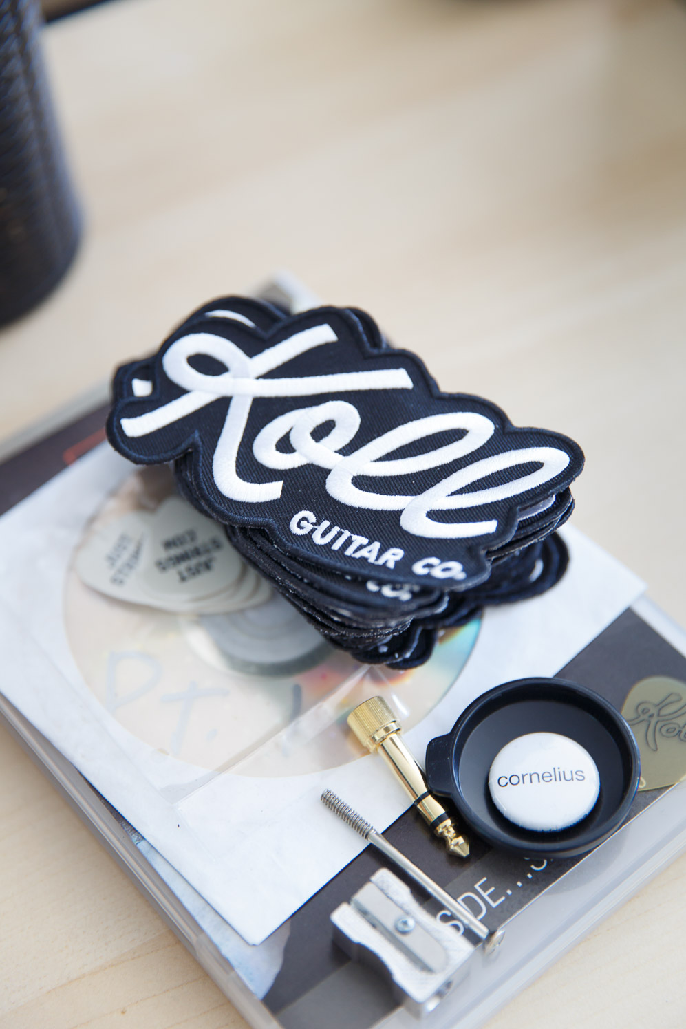 Assembled design paraphernalia gives a glimpse into the wide range of Gary’s output and interests. A Helvetica emblazoned birch skateboard (presented to him by the American Institute of Graphic Arts) sits alongside original Dieter Rams-designed Braun stereophonic equipment, obscure arthouse DVDs, a prodigious design library, handmade guitars from Koll (a small guitar manufacturer in which he is a partner) and so forth.
