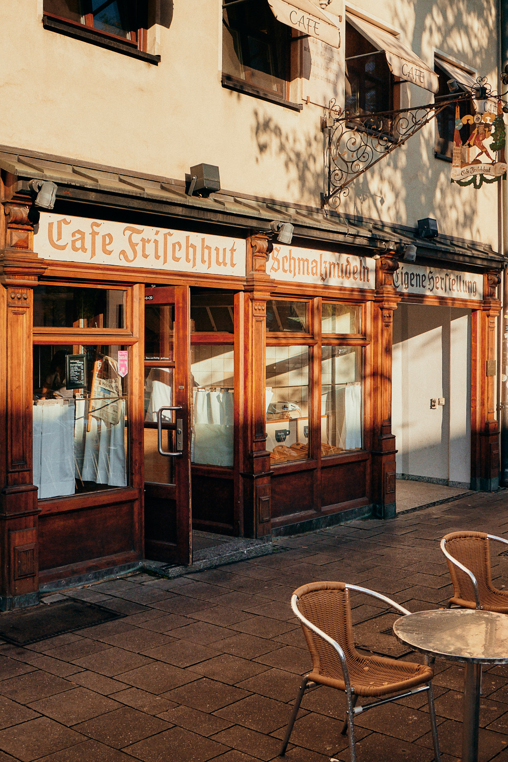Sharing a pastry and coffee in the inviting courtyard of Cafe Frischhut on Prälat-Zistl-Straße.