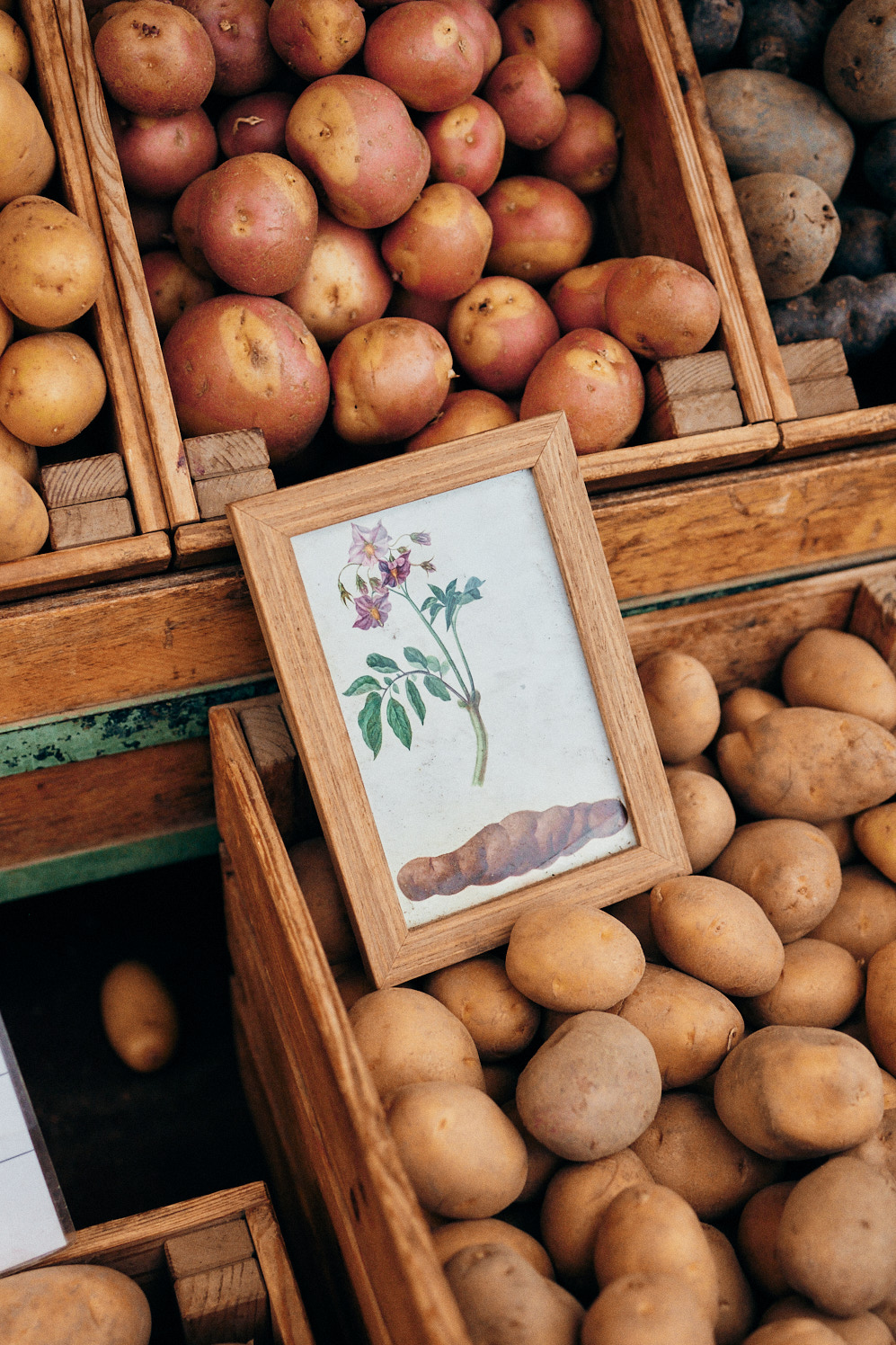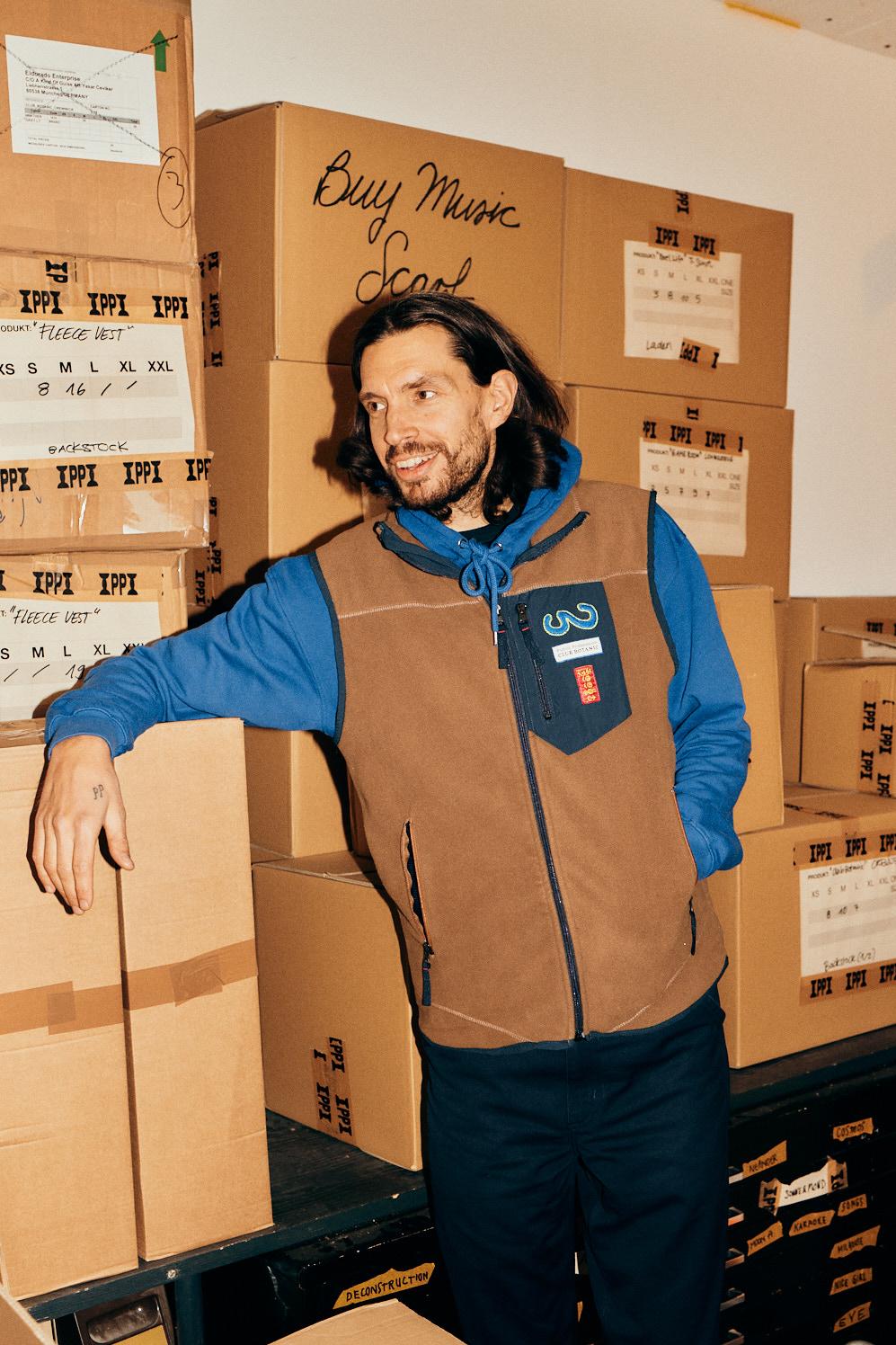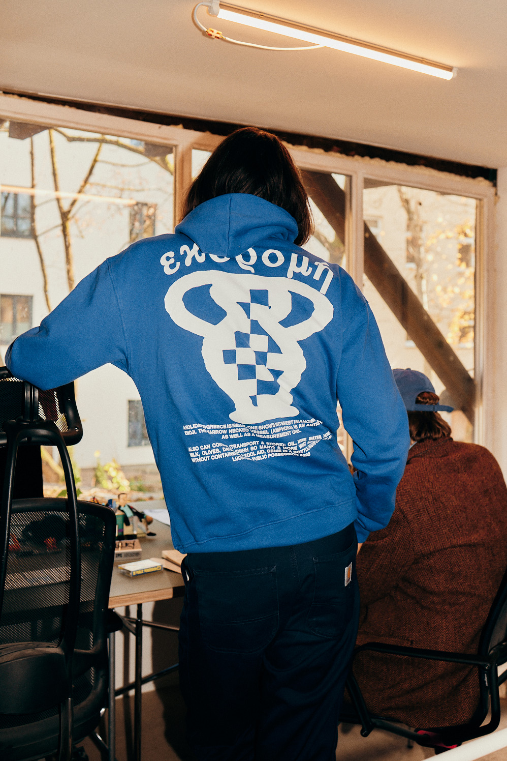 The designs they had at their live shows were the beginning of Public Possession’s quintessential visual language, which has only become more seasoned as they expanded from DJ sets, to record label, to store owners. With their shared interest in subcultures surrounding music genres and their affinity for design, they began to emphasize the relationship between the two in their work. They started creating prints and garments in-house with their own distinctive imagery. It’s a supremely confident, striking mix of aesthetics: you can see the skate and post-ironic influences bleeding through, and there are notes of punkish nonchalance. They’re also inherently fun; the bold colors and cheeky cartoon characters that pop up in their designs carry a sense of humor that’s unique to Marvin and Valentino. With their trademark style present from the early days, establishing a strong identity was a challenge that they were well-equipped to handle. It was also a draw for collaborators and clients: the mix of self-assured artistry and sardonic humor in their graphic design attracted the attention of those beyond who had attended gigs or visited the store. A strong example of their collaborations are the special edition sweatshirt and t-shirt designs they created for Caspar Plautz, on Viktualienmarkt, a much-beloved food stall known for its adventurous meals centered around potatoes. The stall is local to Valentino and Marvin, and shares many of the values of Public Possession: authenticity merged with sleek branding, passion for creating, a freshness in how they approach their work.