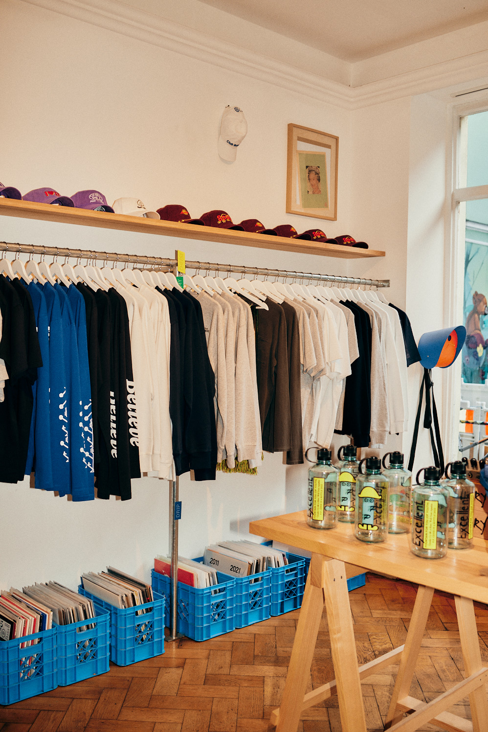 From their gigging, ever-expanding group of cohorts, and the visual identity they were carving out for themselves, opening a physical space seemed to be the natural progression. It started off as a “classic record store”, says Valentino, which conjures up a fairly straightforward image: charting records and CDs lined on minimalist shelves, posters of newly-released movies to flick through, an area curated to be little other than transactional. But Marvin and Valentino hand-picked the music that they wanted to share—music that sounded fresh and exciting to them—and collected stacks of records to be rummaged through and relished. As with their DJ sets, their own design work adorned the store from the early days. The choice to set up in Munich naturally drew a community to their doorstep; in comparison to larger cities such as Berlin, which have the perpetual hum of new projects and a plague of anonymity, there was truly nobody doing what they were doing in Munich when they began. “It’s not only a shop, it’s also a place where people can meet and connect and talk about music,” Marvin says, “[it’s] a community place where people can come together.” Infused with idiosyncratic charm, the record store has a freshness that belies its years. Bold colors and contemporary prints pepper the walls. Their merchandise—bright t-shirts, cotton tote bags, cheerful caps—perch on window-sills or hang to the side. Generous stacks of records, magazines, and graphics are cherry-picked by the team and line the walls, a dream for any melomaniac looking to get lost while browsing.
