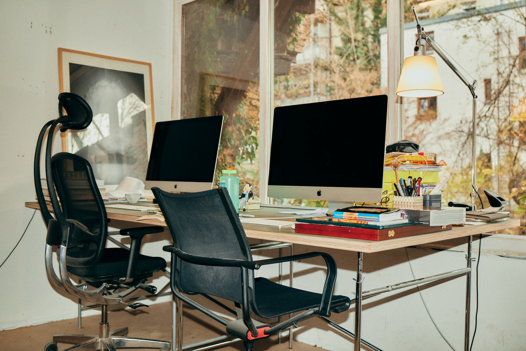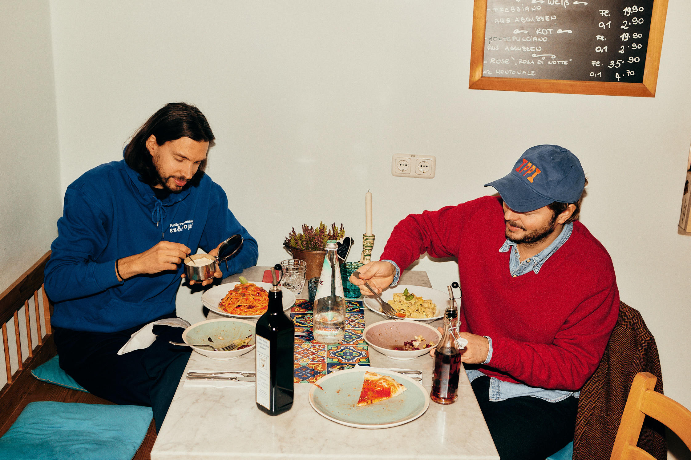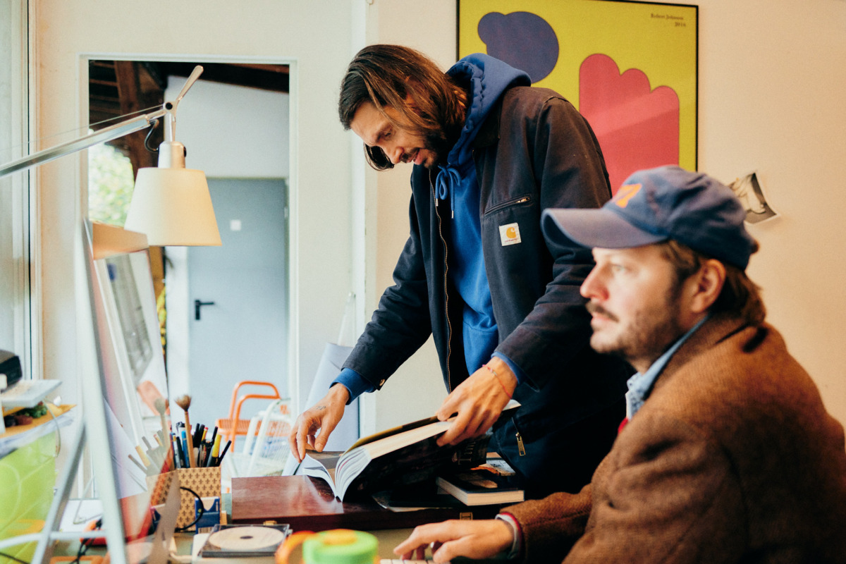 They still have a routine, of course: “there’s no job where there’s no routine,” Valentino grins. Whilst they make efforts to balance the fun and creative work with the more menial tasks, they spend a decent amount of their day-to-day at the computer (“it’s an actual office job”). Regardless, the routine itself allows for plans to be hatched and projects to take shape, and it suggests a comforting pattern: “We meet here, we drink a coffee, and then we start talking,” says Marvin. It’s key for their creative conspirations that they both be in the same room, as they struggle working remotely. Their ideas bloom when they are in close quarters, able to toss ideas between each other and tease out the finicky finishings to new ventures. Through these seemingly mundane rituals, they’ve built a foundation to follow ideas and inspirations with conviction.