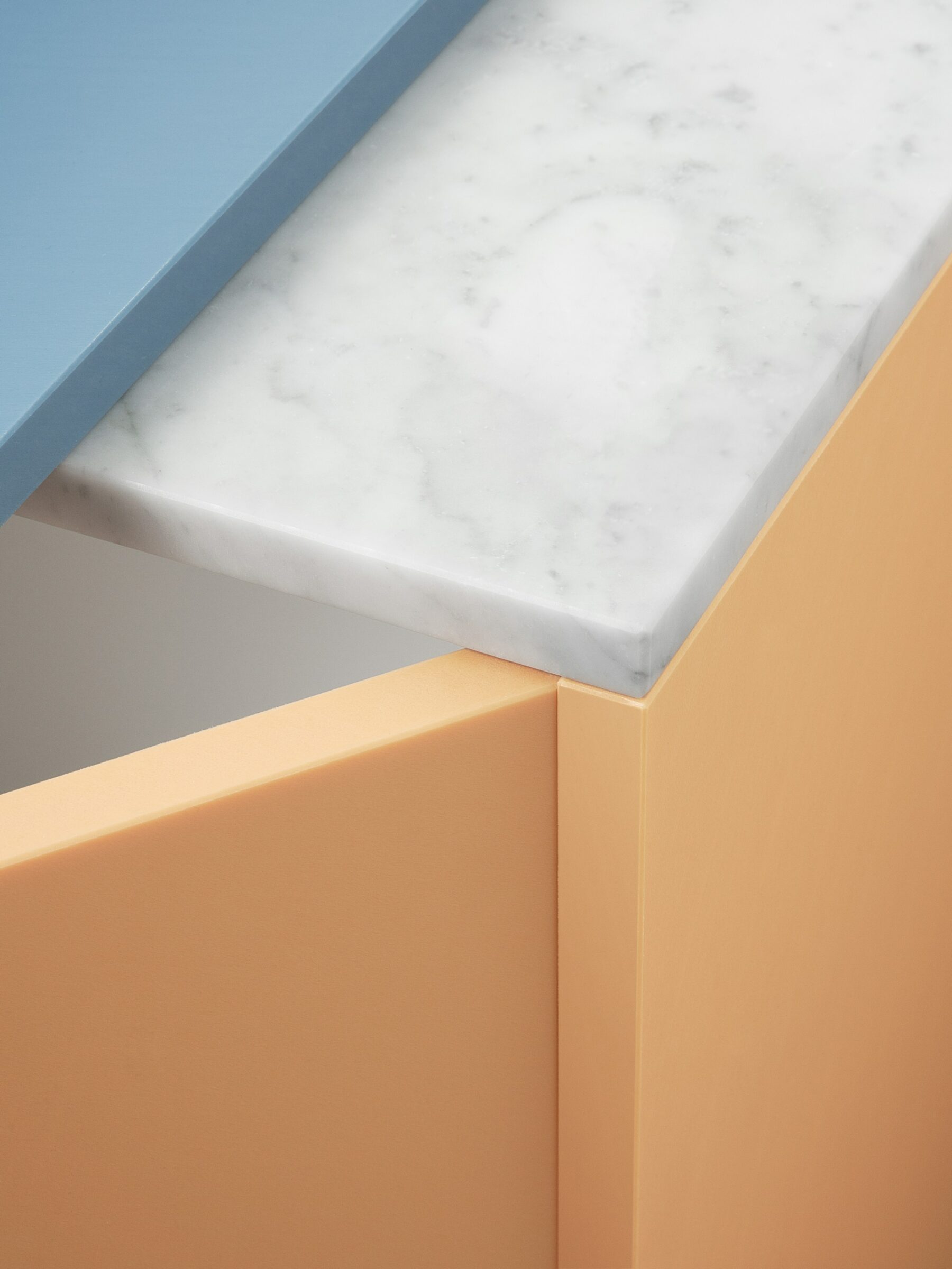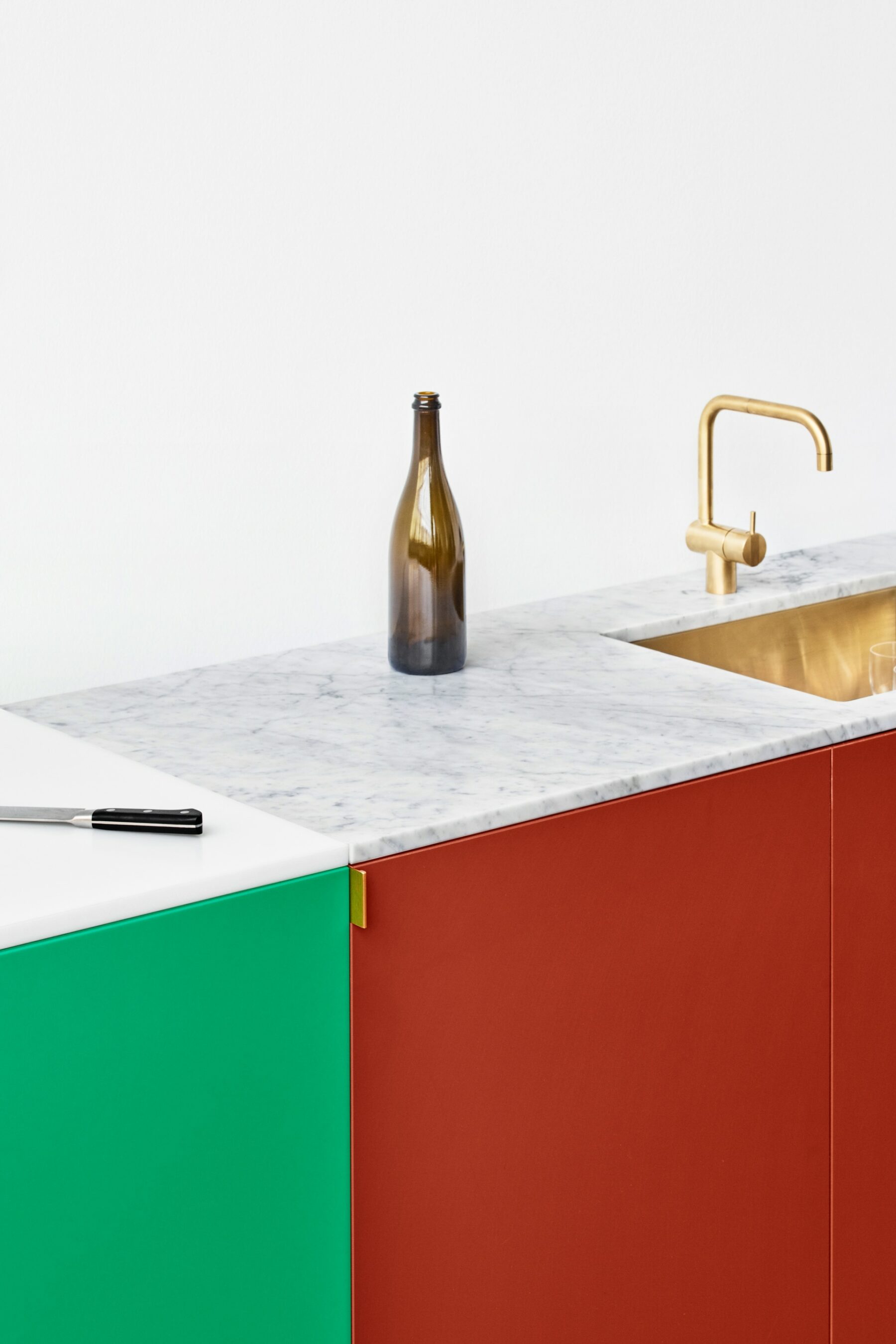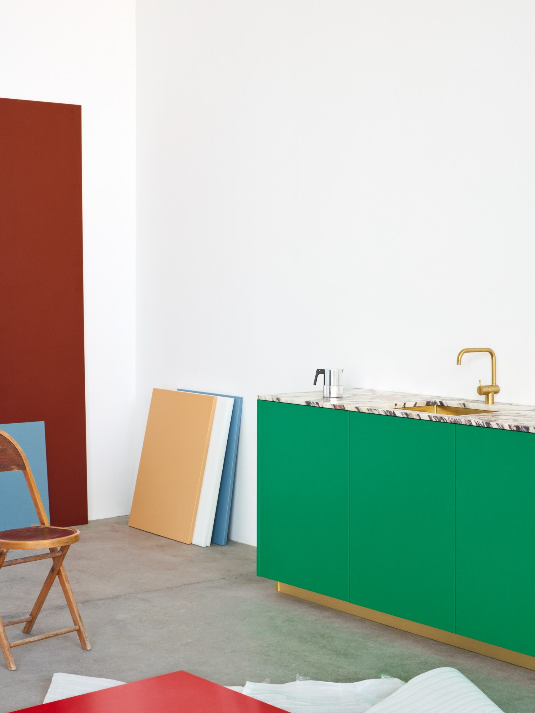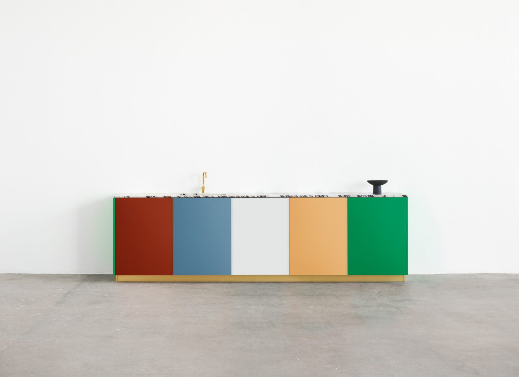 One such brand Muller Van Severen have worked with is the Danish kitchen company Reform. Founded in Copenhagen and now based in Berlin—with showrooms in cities such as Cologne, New York, and very soon L.A., Hamburg and Munich—Reform work with a plethora of different designers from all over the world to create kitchens that combine quality construction, function, and timeless design. For their kitchen design, which was released earlier this year, Muller Van Severen worked primarily with polyethylene, a “fantastic material” that they’ve used many times previously. “It’s like plastic, but not a dead plastic. It’s more like candle fat and it’s used in chopping boards,” explains Van Severen. “We wanted to work with it because of its connection to the kitchen industry,” he continues, explaining that they combined this modern synthetic material with more traditional ones like brass and marble. “They sit beautifully in harmony together,” says Muller. “Even though they come from completely different time periods,” adds Van Severen.