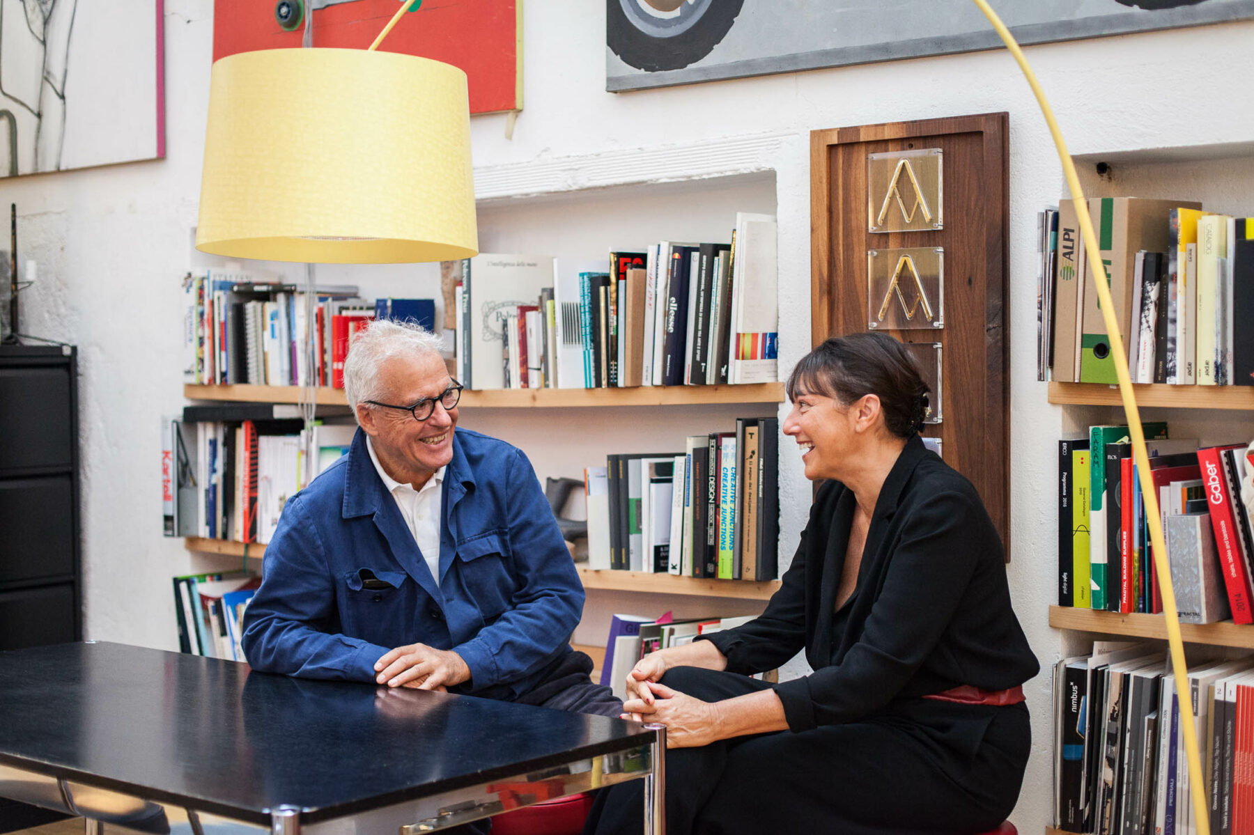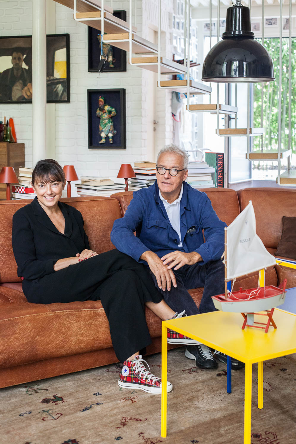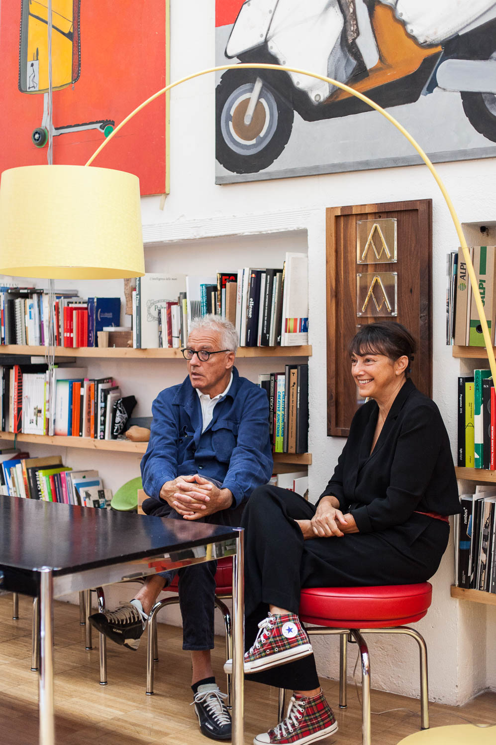 When asked when they met, Marc answers immediately “yesterday,” before jovially correcting himself, “no, twenty years ago.” An award-winning designer, Marc has sought to create technology that revolutionizes lifestyles, be it through sport, food or interiors. He realizes these works at their studio, a stone’s throw from their house in Milan’s industrial estate, Zona Tortona, where Paola then works on the end process—the colors, the PR and, crucially, the naming of each product. She came up with “Twiggy,” for example, Marc’s whimsical lamp modeled after the original that sits in their home, based on the curved profile of a fishing rod. “We work on projects together, but from a different point of view, not just looking at design from the industrial side but also from the emotional and fun approach. Marc takes the more technical side, and I work on colors and presenting the product to the press and to the company.” This collaborative process distinguishes them from other designers, as “working together from the beginning means that we are not losing the roots of the project. “I don’t have the patience for those aspects.”