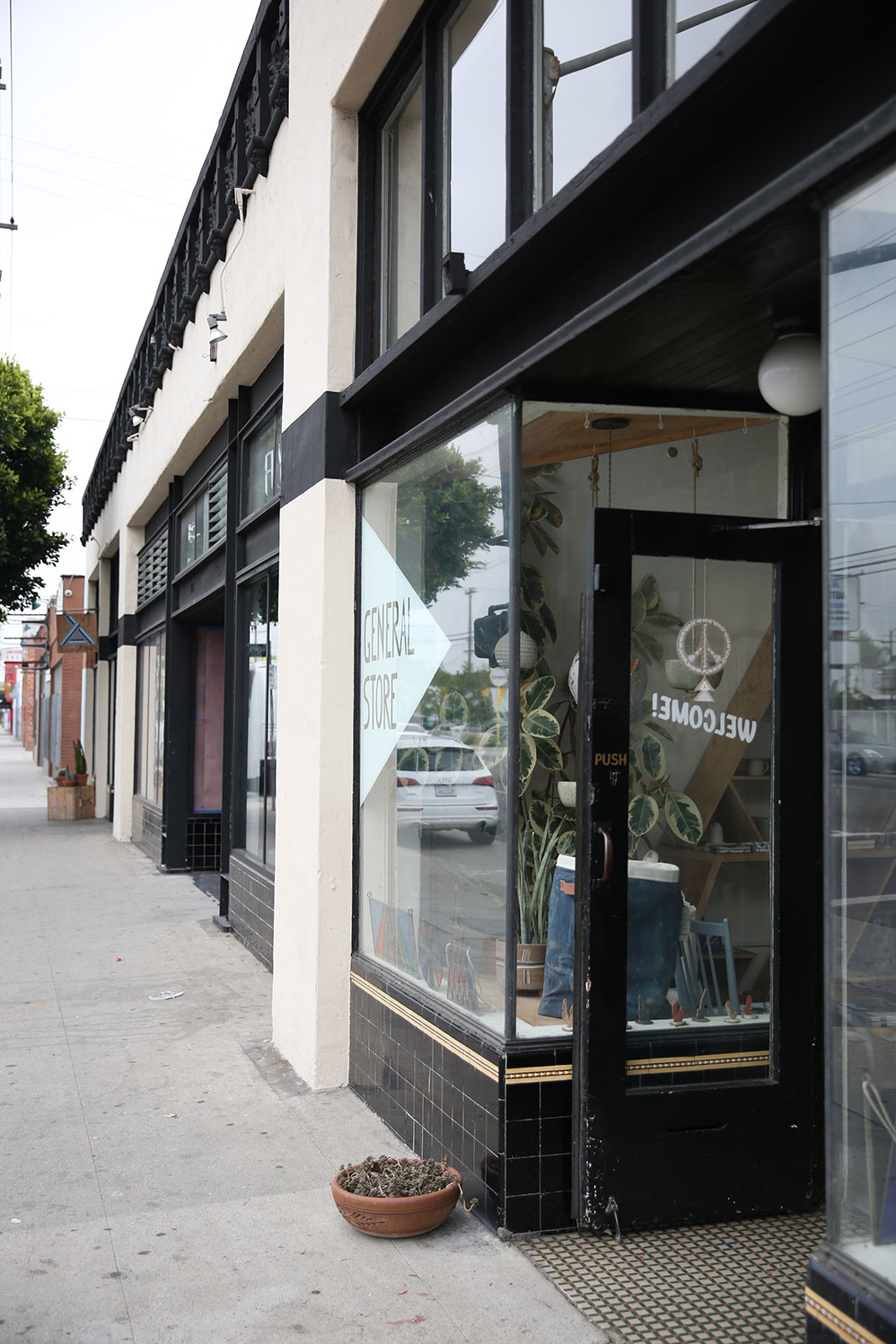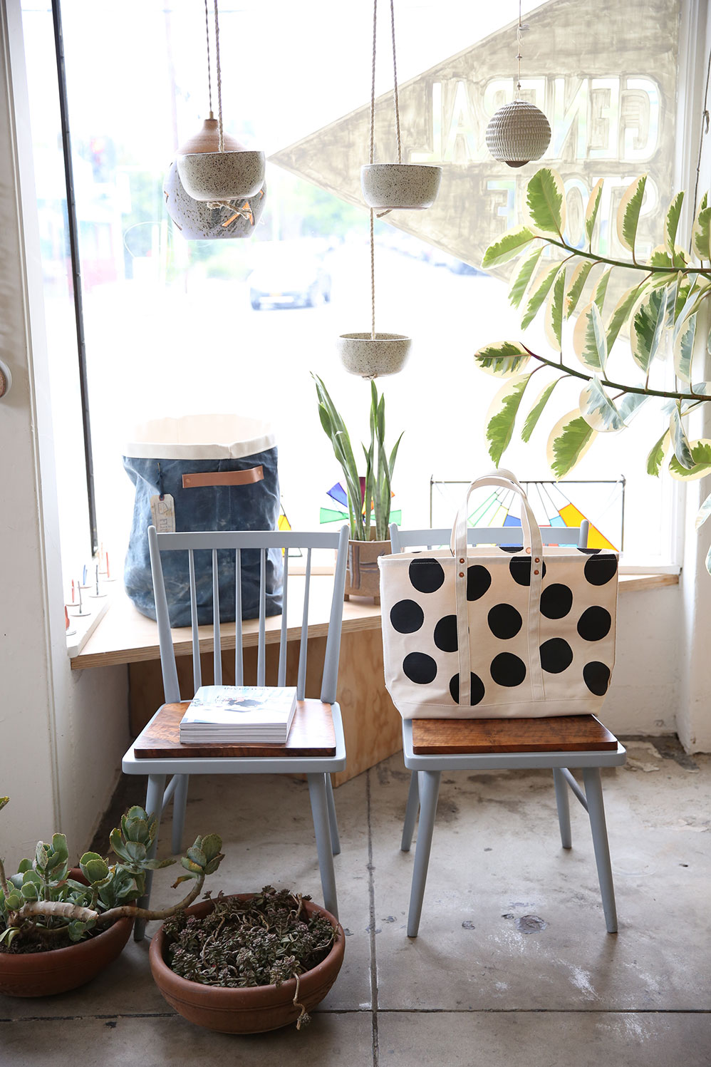 In another, two women, each with a barefoot child, halt a friendly conversation to wave; further down, a man paints in the window of a tiny art studio, raising an arm in neighborly salute. All of it—the greenery, the breezy camaraderie, the lack of footwear, and certainly the chicken—is enough to make one forget that this is Los Angeles. But moments later, the two emerge onto Lincoln Boulevard, a street abuzz with fast-moving traffic. There, at the corner of Superba Avenue is General Store, the shop they opened in the summer of 2012.