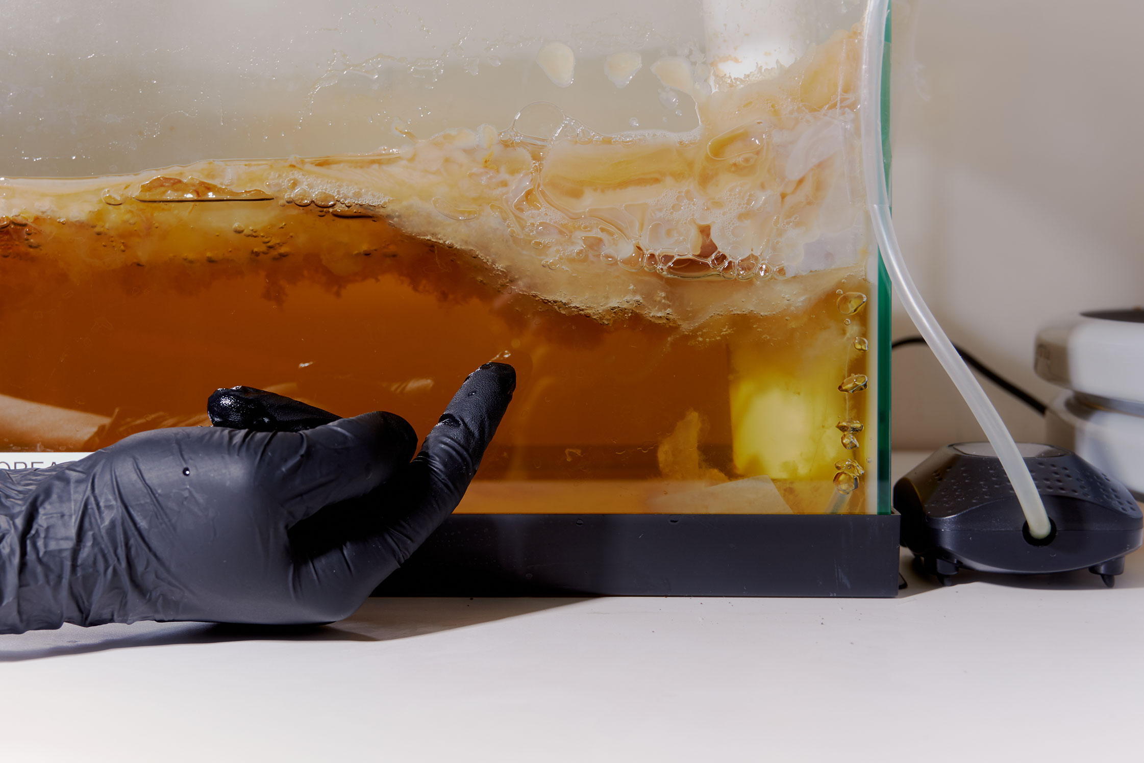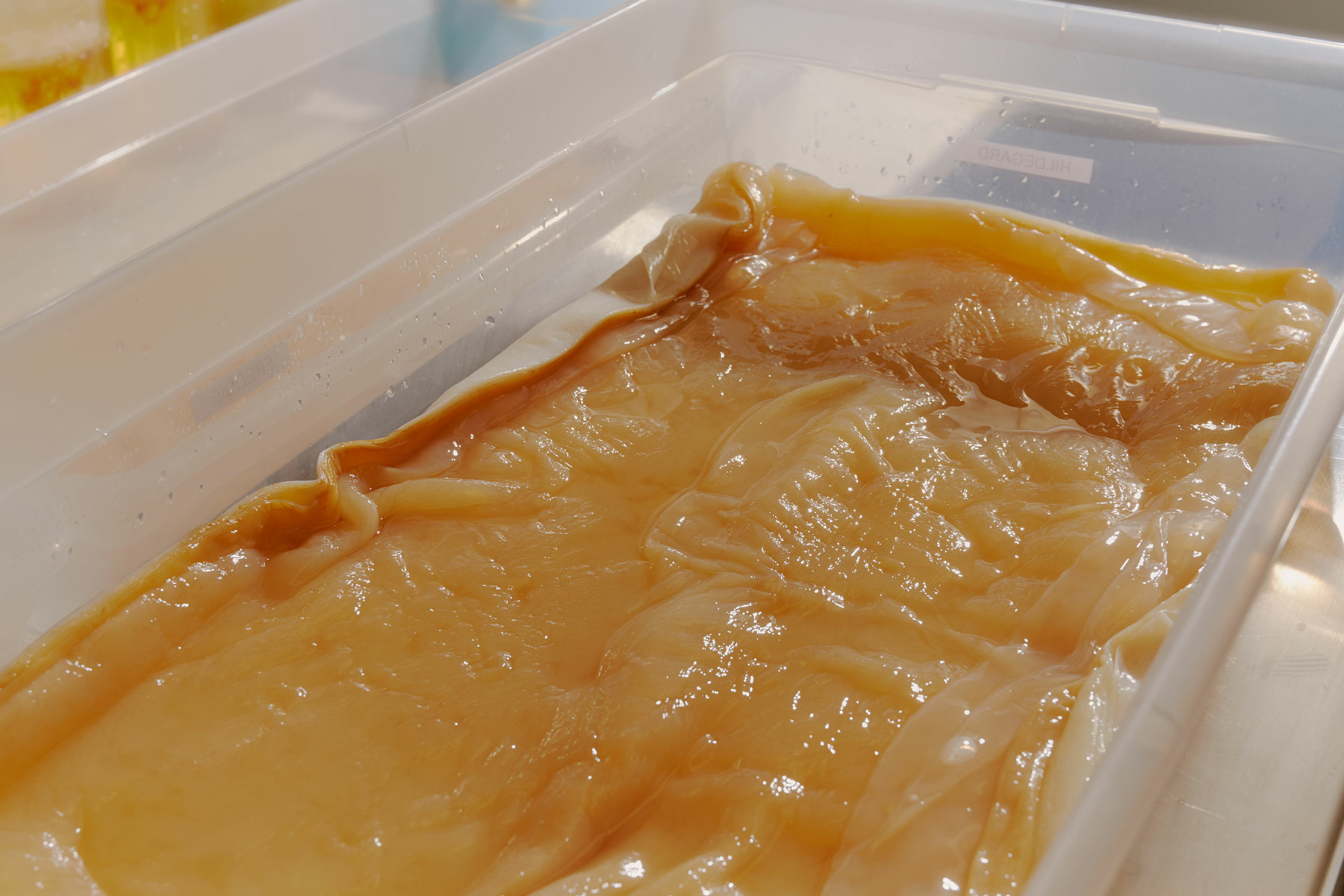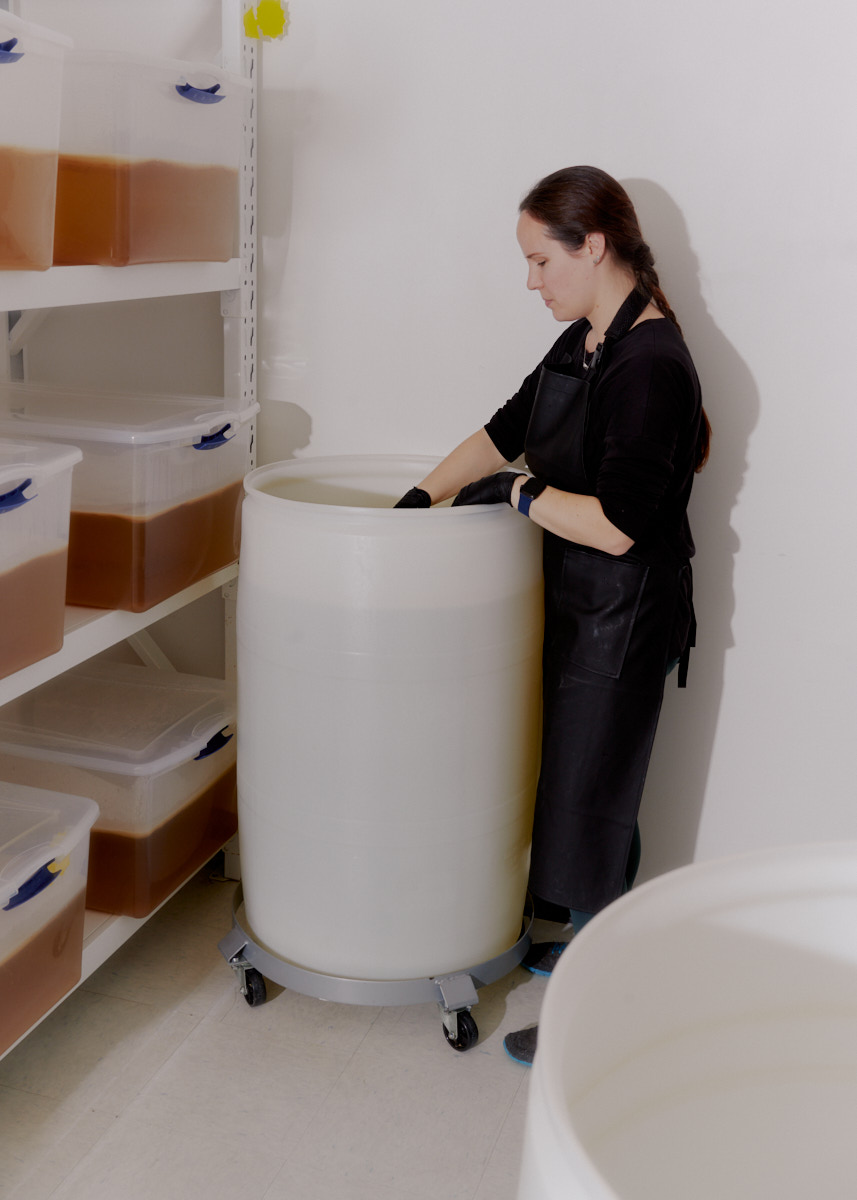 At present, and while Céline is laboring towards a “personal mythology” book that will tell her own story, her team is experimenting with bacteria at their Slowhide lab, which, she says, “will be part of the Slow Factory Institute very soon.” “We are vertically farming bacteria,” she explains, “feeding it tea and coffee waste, and it’s growing. And it’s weaving, bacterial nano-cellulose, which looks and feels like skin.” What stories, one wonders, might emerge there? Céline who, too, is curious, observes that we have a lot to learn from our tiny ancestors.