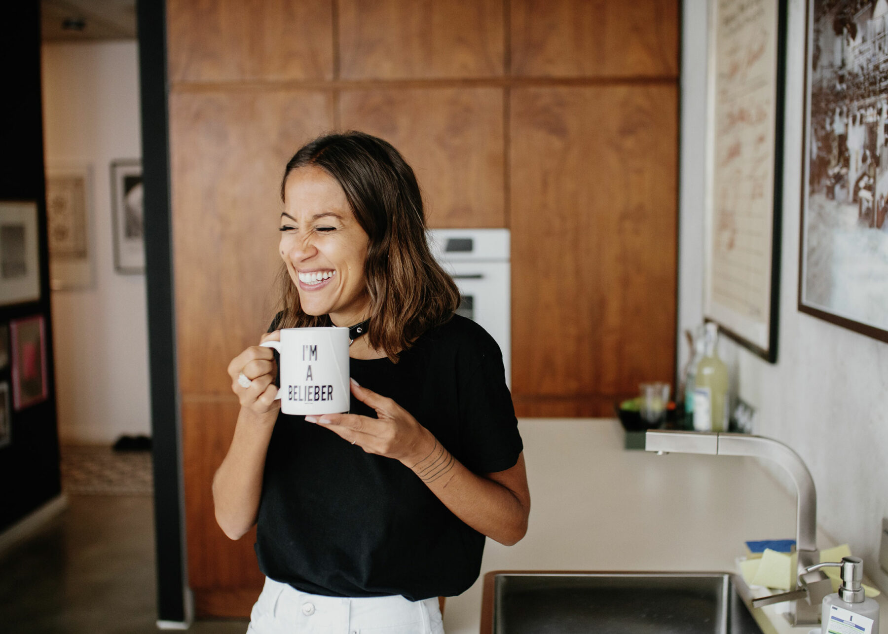 One of these creative forward-thinkers is Rabea Schif, who makes a living by hosting fashion and lifestyle shows (on fashiondaily.tv, ProSieben and VOX) and constantly giving a fresh impetus to fashion broadcast journalism. She opens up her doors with a big smile and a breakfast cup that announces: “I’m a belieber!”