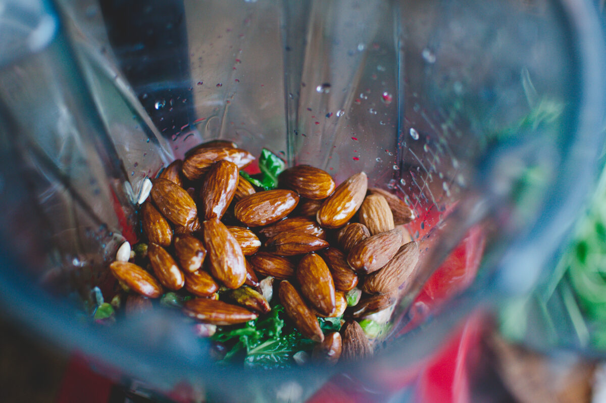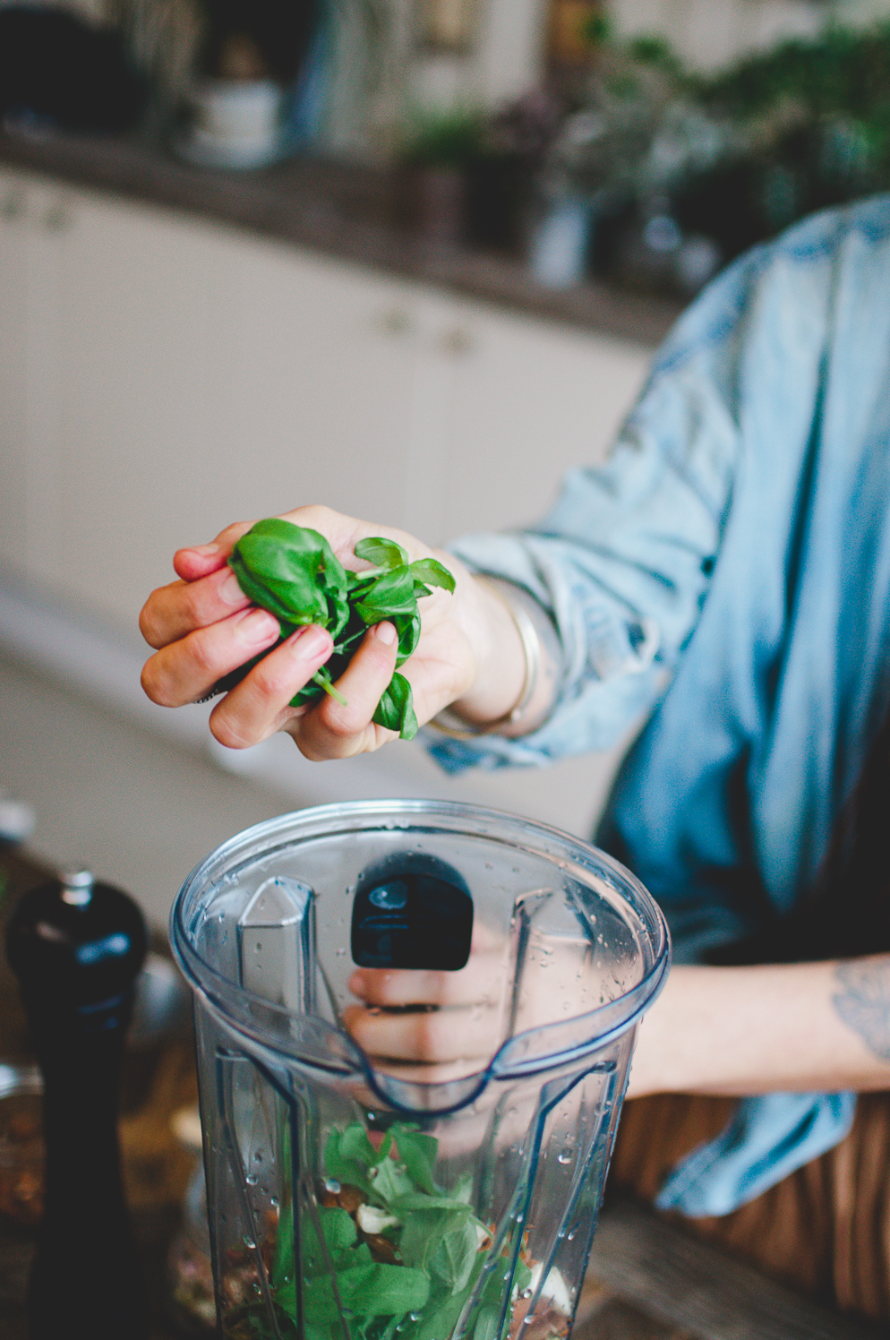 For the pesto, shred and rinse the kale. Place it in a food processor together with the fresh herbs,nuts,lemon and garlic. Add the olive oil and sea salt. Mix in high speed.