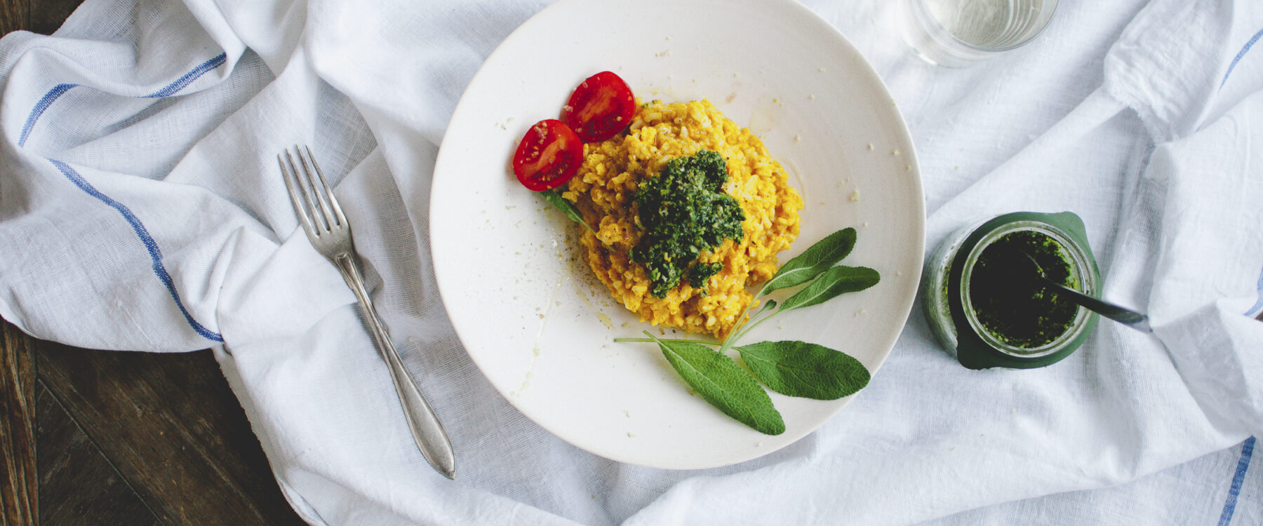 Serve a few spoons of orange risotto on a plate and add the kale pesto on top. You can grate some pistachios and add extra herbs as “the final touch.”