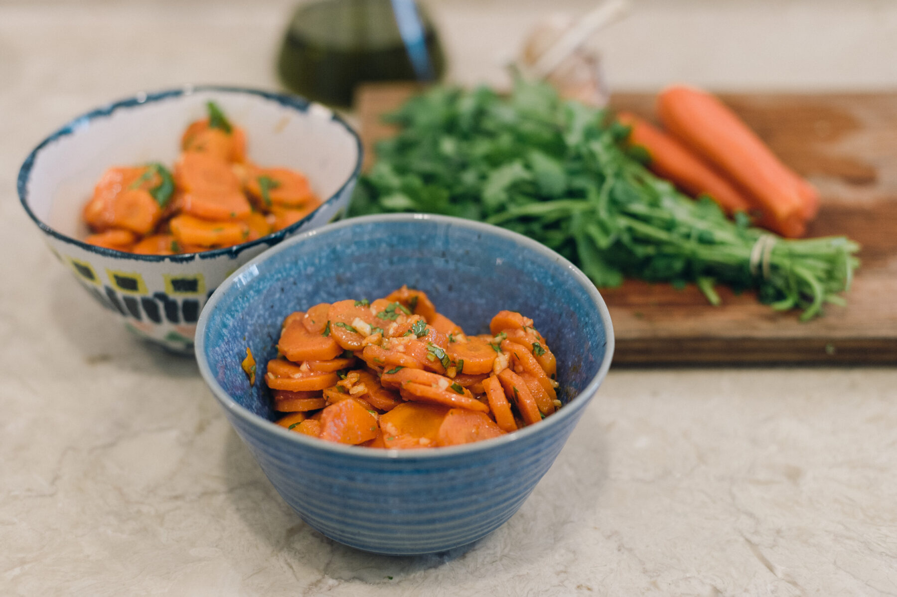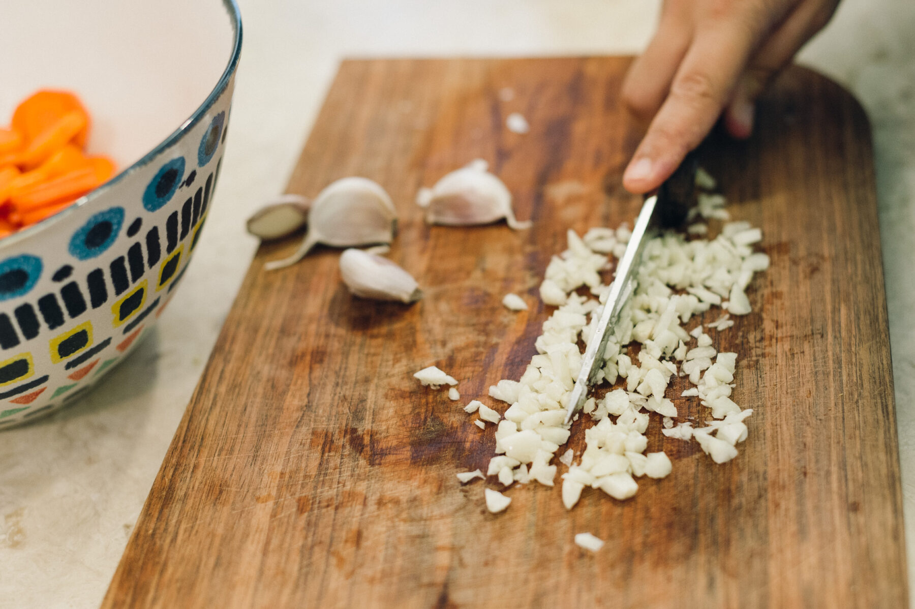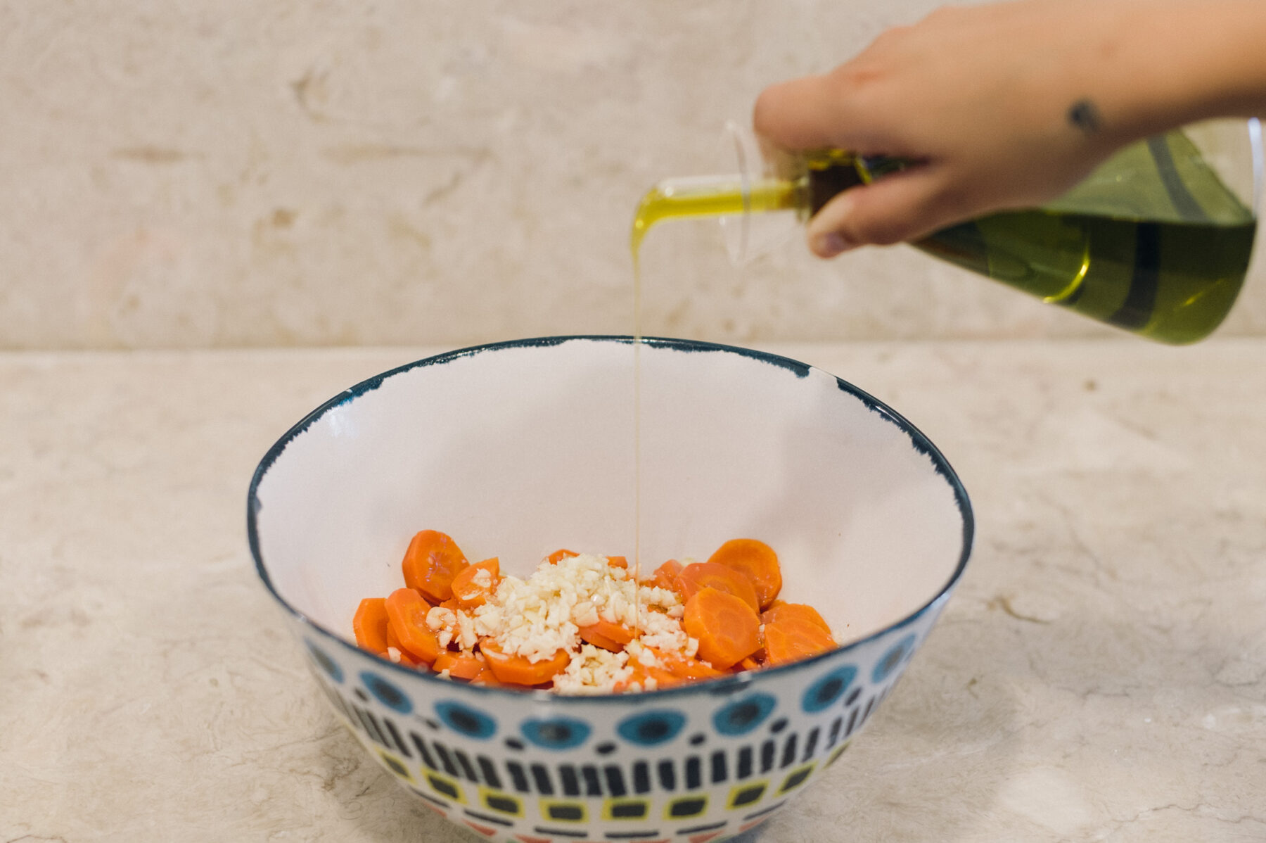 3. Chop the garlic and mix with the warm carrots in a bowl. This will give the carrots more flavor and balance the strong taste of the garlic.
