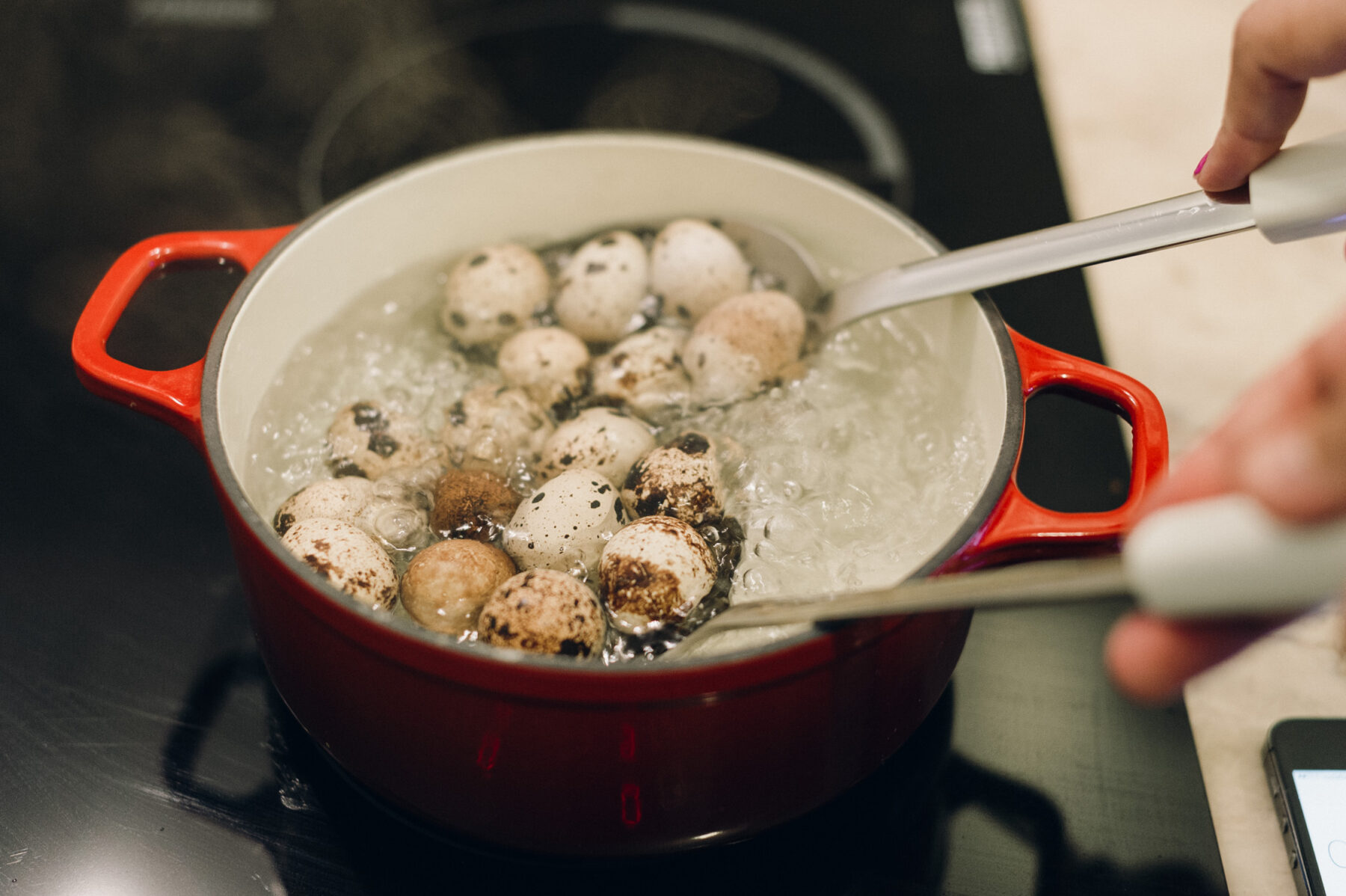 1. Bring a pan with salted water to a boil and carefully place the quail eggs inside using a spoon.
