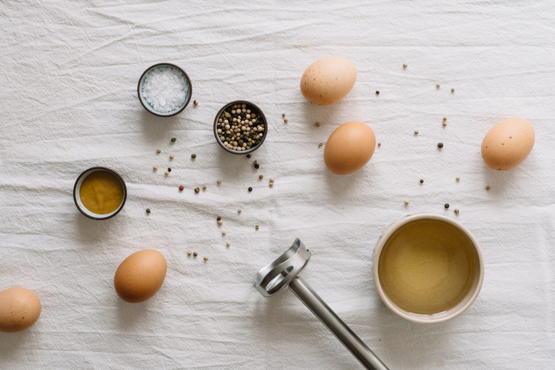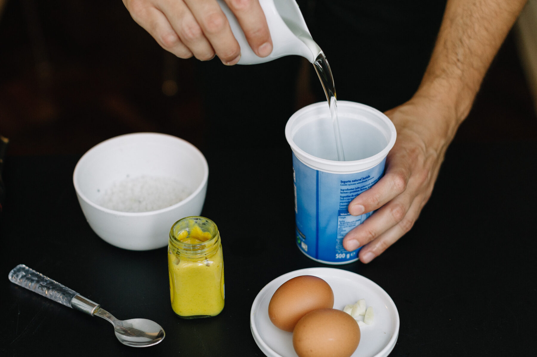 4. In a deep and narrow jug, blend the egg, oil, salt, garlic, mustard and pepper using a hand blender with smooth up and down movements. If you are doing it correctly, you will see that the mixture starts to expand and gain both moisture and yellow color. There are two tricks: don’t do this in a warm environment and add the oil slowly in a thin stream while mixing.