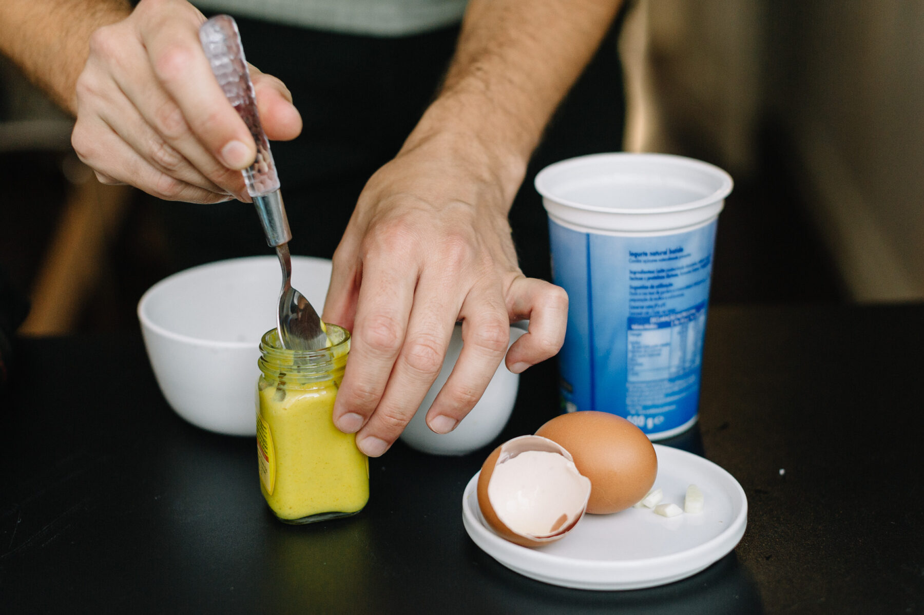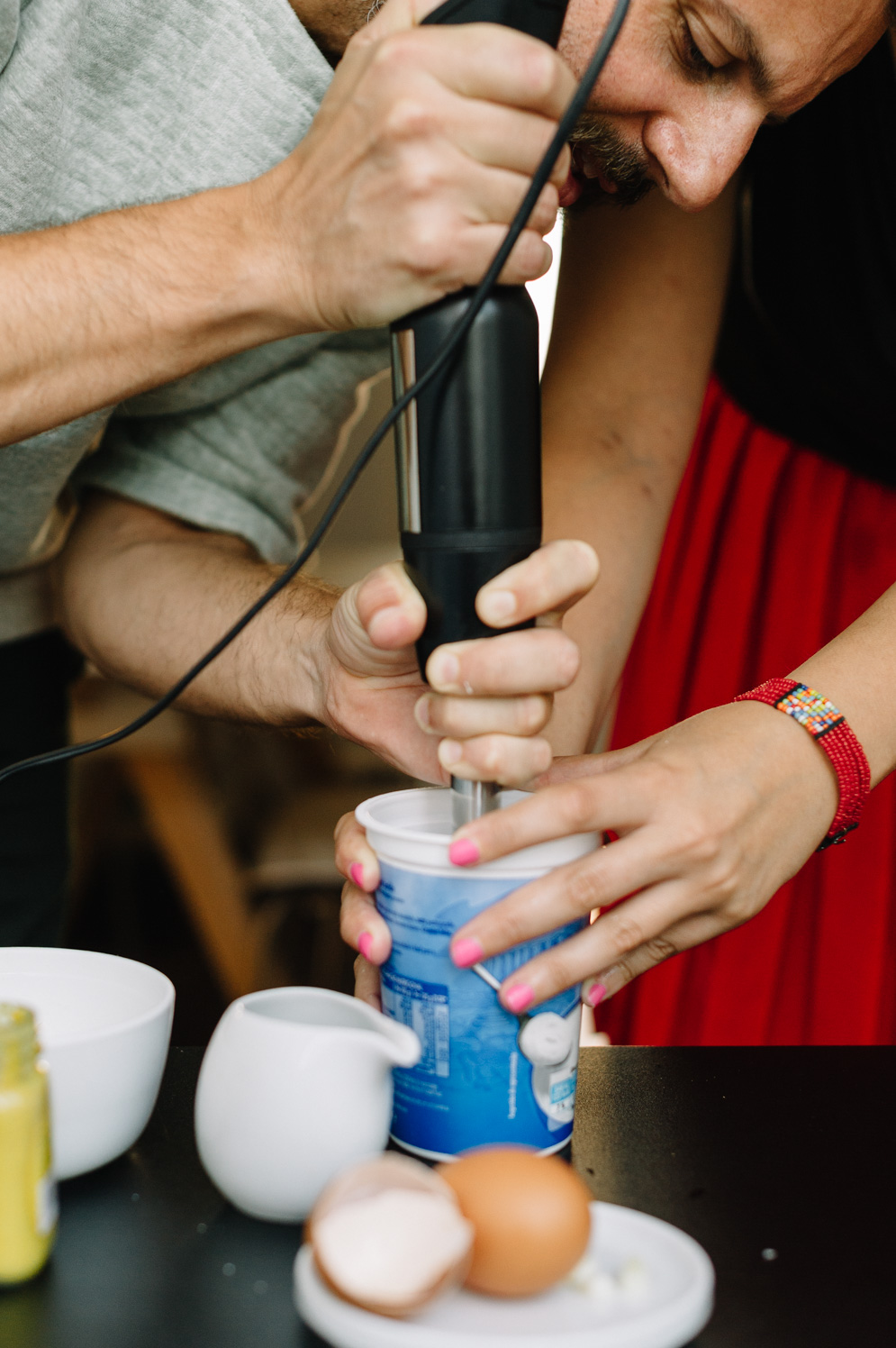 Inês first tasted these at a party and had an epiphany: “I saw the eggs, with some sauce in the middle and when I put them in my mouth, they just melted.” She instantly tried to recreate the dish at home, which proved to be a complicated task. These days, she asks Vasco for assistance, since the mayo can be quite temperamental. A tip from Inês: “You could cheat and just mix mayonnaise with some pickles and spices – but we prefer to do the mayonnaise from scratch.”  Still, the effort is clearly worth it.
