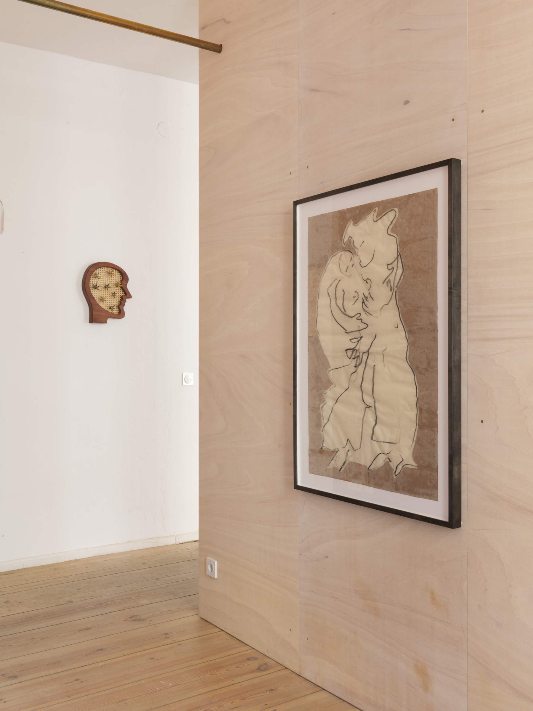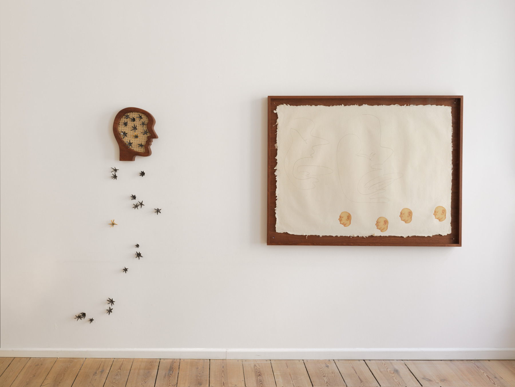 Anousha — There will be two rattan and walnut wood heads with ceramic flowers for the show. The character is based on both the folktale ‘A Flowering Tree’ and the character Mahdokt from Parispur’s 1990 story collection ‘Women without Men’. ‘A Flowering Tree’ is about a woman who repeatedly transforms into a tree. Always performing for others rather than herself. Her generosity is taken advantage of, and she becomes stuck—half human/half ‘thing’. The works are about returning her autonomy to her.  I will also show two paintings that are based on a character from a short story I wrote—called The Gravity of Fur. The protagonist, trapped in loneliness and the meaninglessness of life, builds her narrative by creating a love affair with an imagined creature. The paintings question whether it’s an existentialist attitude or a dissociative one. A love affair with a creature that cannot and does not exist.   Laila — I will show three pieces that are part of a larger body of work reflecting on womanhood and consequent dynamics of control (political and domestic). The two faces used in the paintings are recurring characters at the moment. The large male face is fashioned after a totalitarian, a policer. His brow is heavy, and his ears large. The small women are women in totality. The faces are all in profile to avoid any sense of individuality—they are signifiers, unrecognizable outside of their purpose. All the characters are in a state of movement, walking/marching. The frames are made of wood to acknowledge that all these observations are happening from within the home. They are adjacent to domestic objects like cupboards and tables. All three pieces are titled after bugs, Lice, Termites, and Bedbugs. They’re pestilent and unrelenting—they’re thoughts.