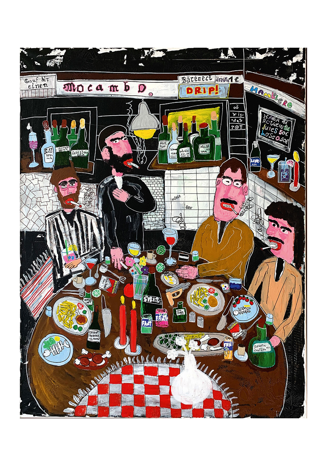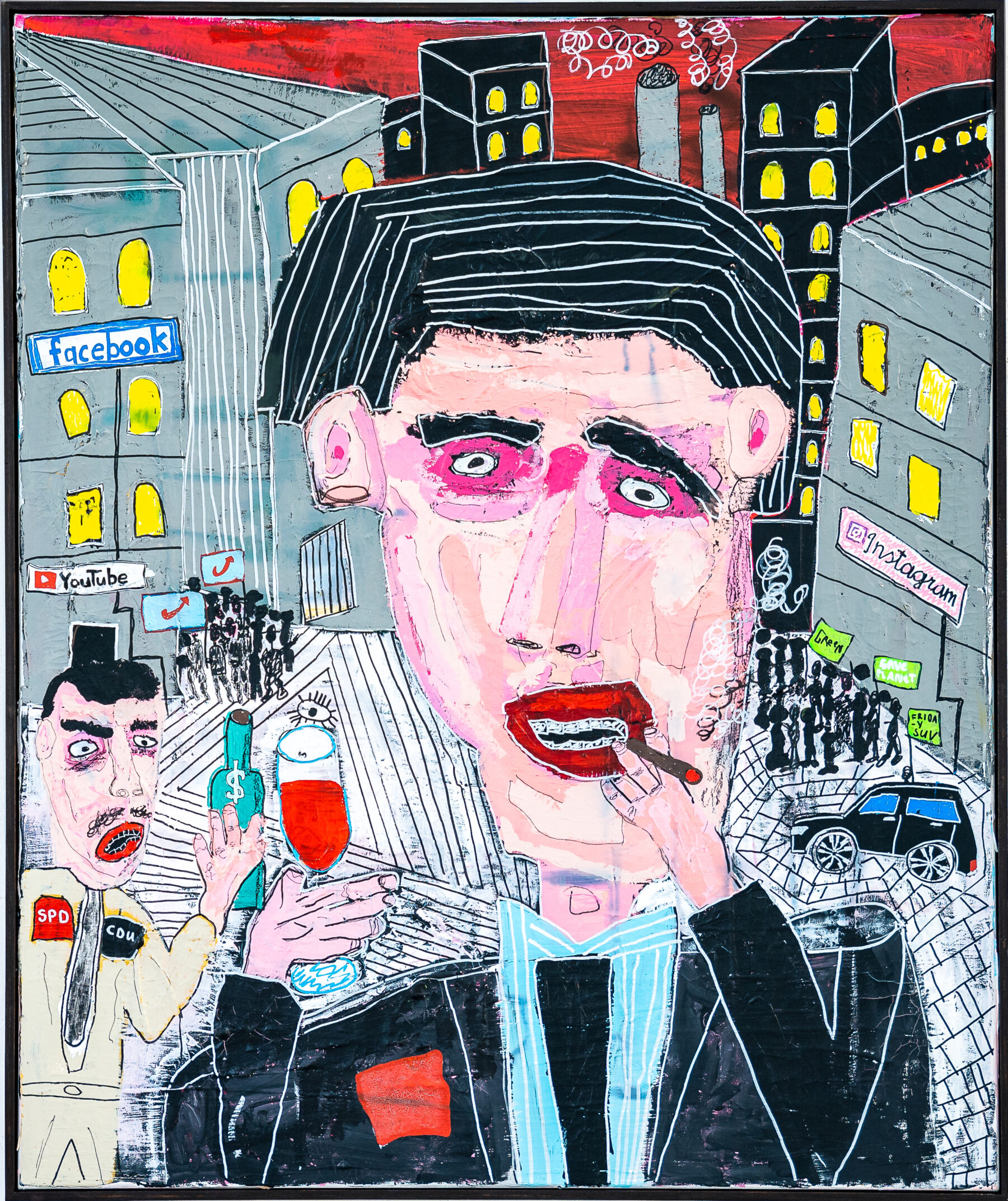 My paintings have different styles, but you could generally describe them as modern, abstract, or neo expressionist. The figurative paintings are inspired by the era of the New Objectivity and Expressionism which evolved 100 years ago during Germany’s Weimar Republic. It was a time that is comparable to now on some levels in terms of political polarization, economic depression, and technological revolution. My bigger paintings are definitely inspired by American Expressionist painters. My favorite artists are Picasso, George Grosz, Otto Dix, and Jonas Wood, who is a brilliant contemporary artist.