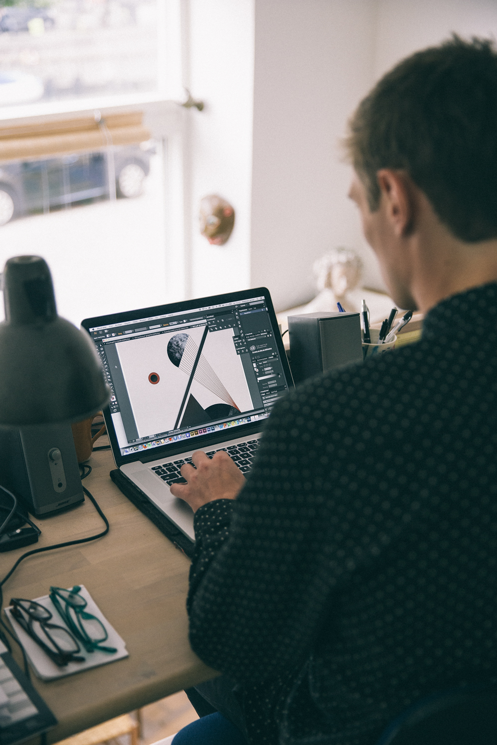 However, his creative output is not limited to the hours he spends at his desk. He works compulsively and intuitively, sketching and logging references and inspiration wherever he might be. He pulls on these resources to produce posters with a subdued Nordic minimalism, which is also reflected in his neat and unfussy appearance.