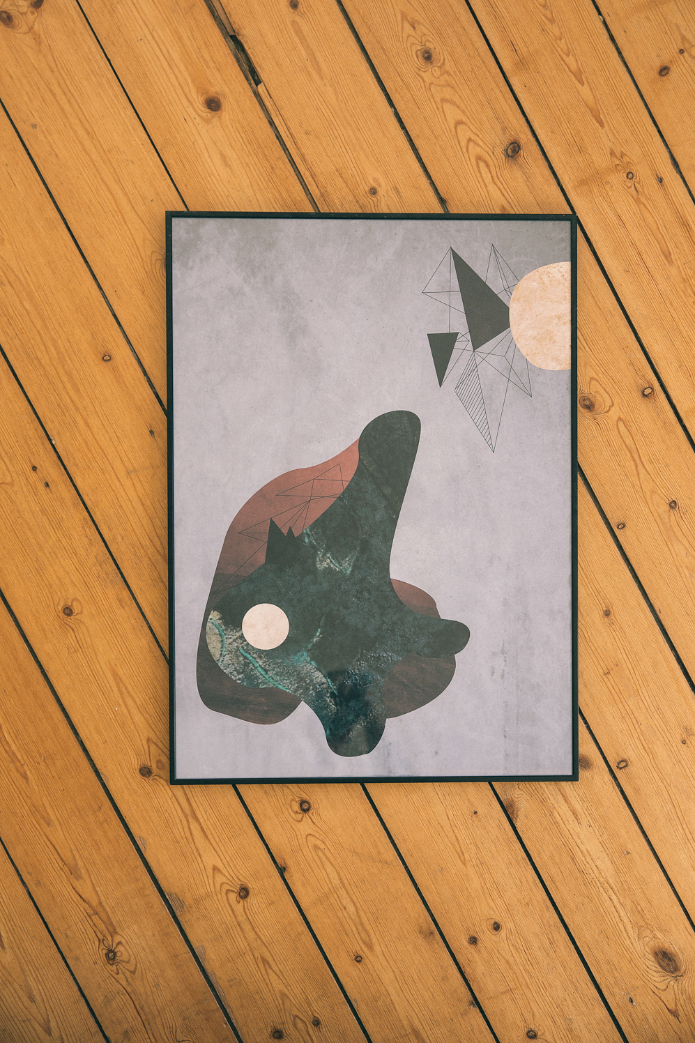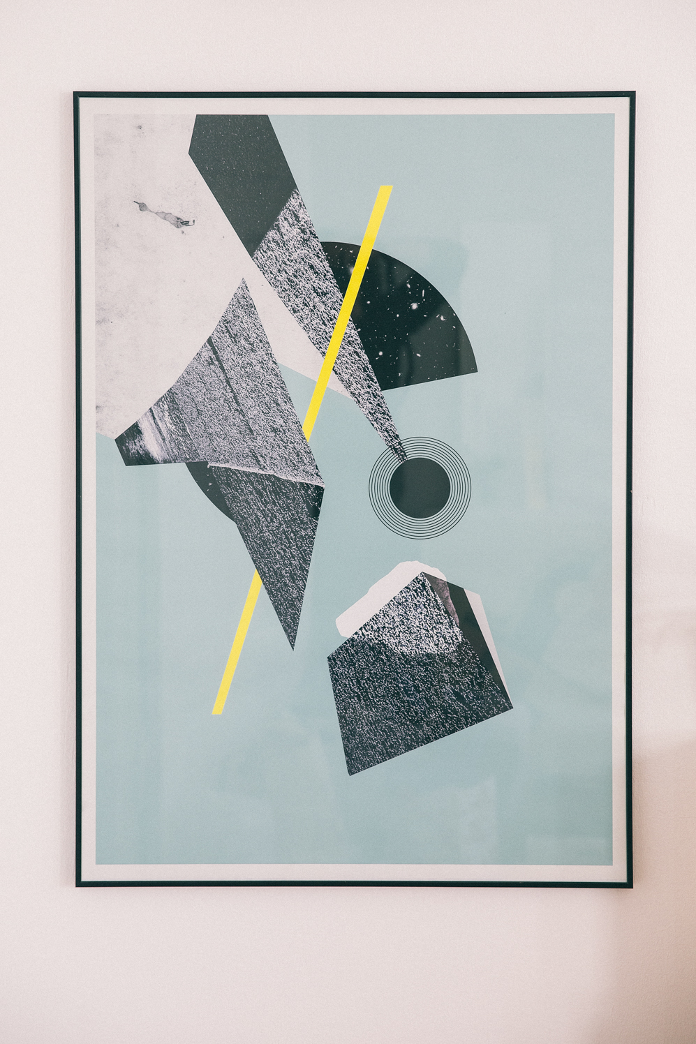 This one is called Bau3, which is part of a series of posters that is inspired by the geometric Bauhaus movement. For the texture, I used photos I shot while I was on a holiday. I made them black and white in order to create a contrast between the rough elements and the clean background. When I make these types of posters, I create the different elements on a computer and move them around until, after a few days, I manage to find the right balance. It’s often the small details I spend the most amount of time on. It’s a combination of colors, textures and forms. It’s a compositional game, to create tension by placing the elements in the right space in relation to each other. But it can’t be too perfect – there also has to be a little imbalance.