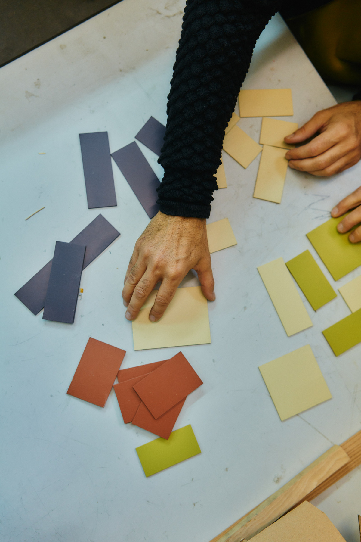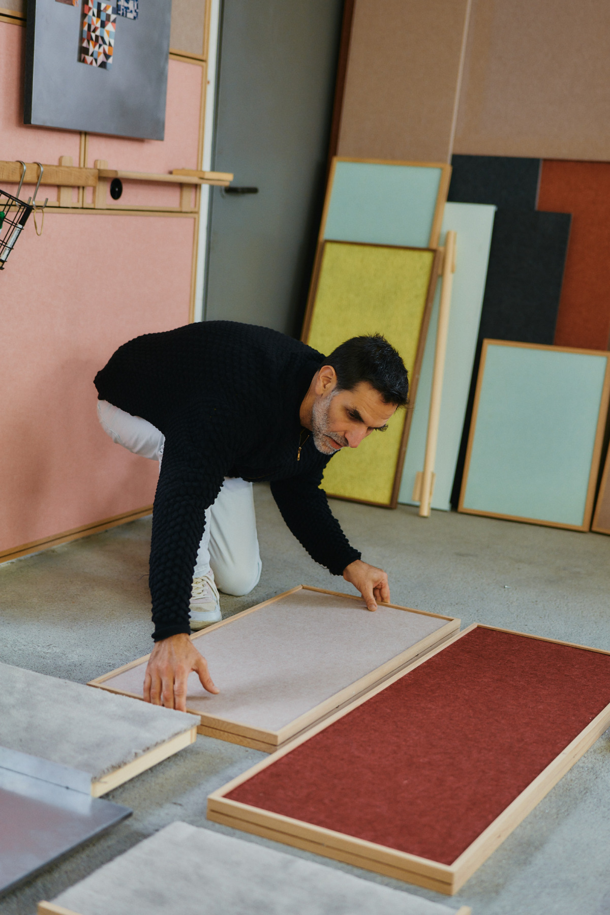 Thomas— We wanted to insulate the walls of our office, and we wanted a material with acoustic absorption properties that looked nice and was made from scraps. So we asked Impact Acoustic if they had any leftovers. They responded, “Yes, a lot of them,” and said that they’d also like to find a way of dealing with leftovers. Our respective requirements led to this collaboration in which we developed not just a product for the office, but a product that offers the possibility of transforming leftovers into a fully-fledged, high-quality material. The collaboration was a really interesting, flowing process. Yves— What emerged from the process is a modular system. The leftover pieces work in relation to one another. It’s like a pattern, there’s always logic in it. That means you can play with the design. In the development process, we explored how colors, proportions, and sizes could work together in a modular system. We chose to put them in wooden frames—quite like picture frames—made of wood. You can see it’s a product and not just a wall covering. Alongside these aesthetic considerations, we treated the leftovers through a sustainable lens. For example, they’re clamped together. Normally, these panels are glued on with construction adhesive so when you want to take them off again, the panel will break and end up in the bin. With our system, the fact that they’re only clamped means that if one is defective or dirty, you can turn it, move it, or replace it. So the prototype’s modularity is linked to its sustainability credentials, which are orientated towards the circular economy. You can repair everything or easily disassemble it into its parts, which is very important to us and Impact Acoustic.