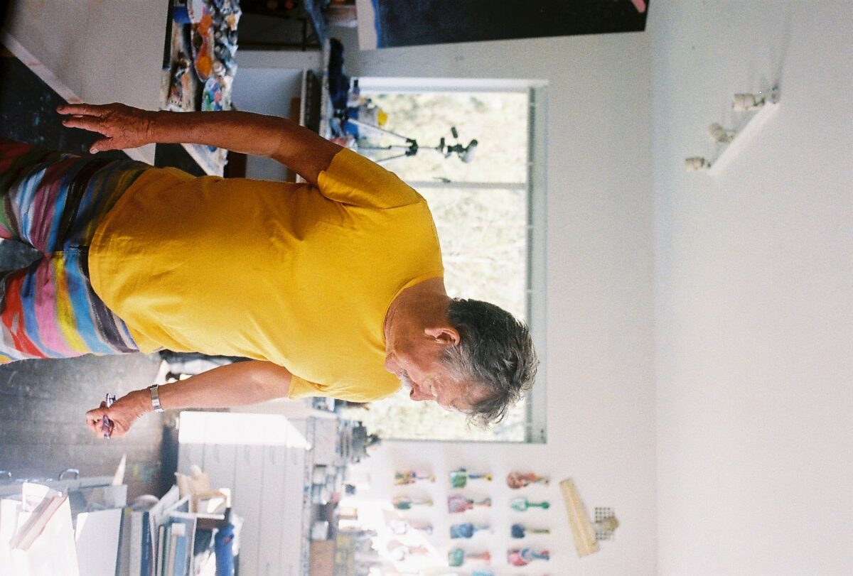 From his brightly lit studio perched on the cliffs above Sydney’s Chinamans Beach, the laconic and irreverent 75 year-old with the ever-present silver moustache continues to paint every day pausing only to swim, snooze and savor the view.